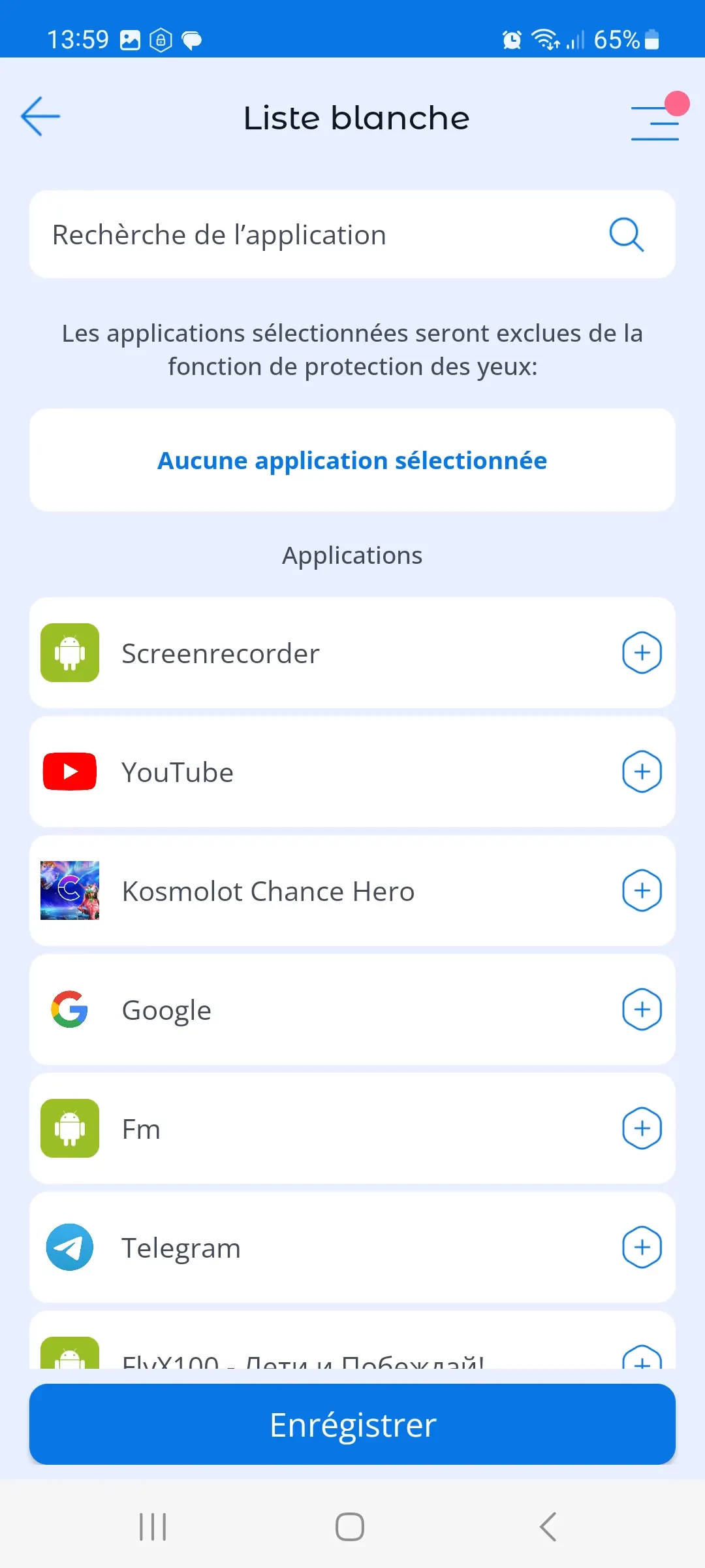 Liste blanche: Si vous ne souhaitez pas que PROTÉGER LES YEUX DE L'ENFANT bloque certaines applications, vous pouvez les ajouter à une liste blanche et l'écran ne se verrouillera pas lorsque ces applications seront lancées.