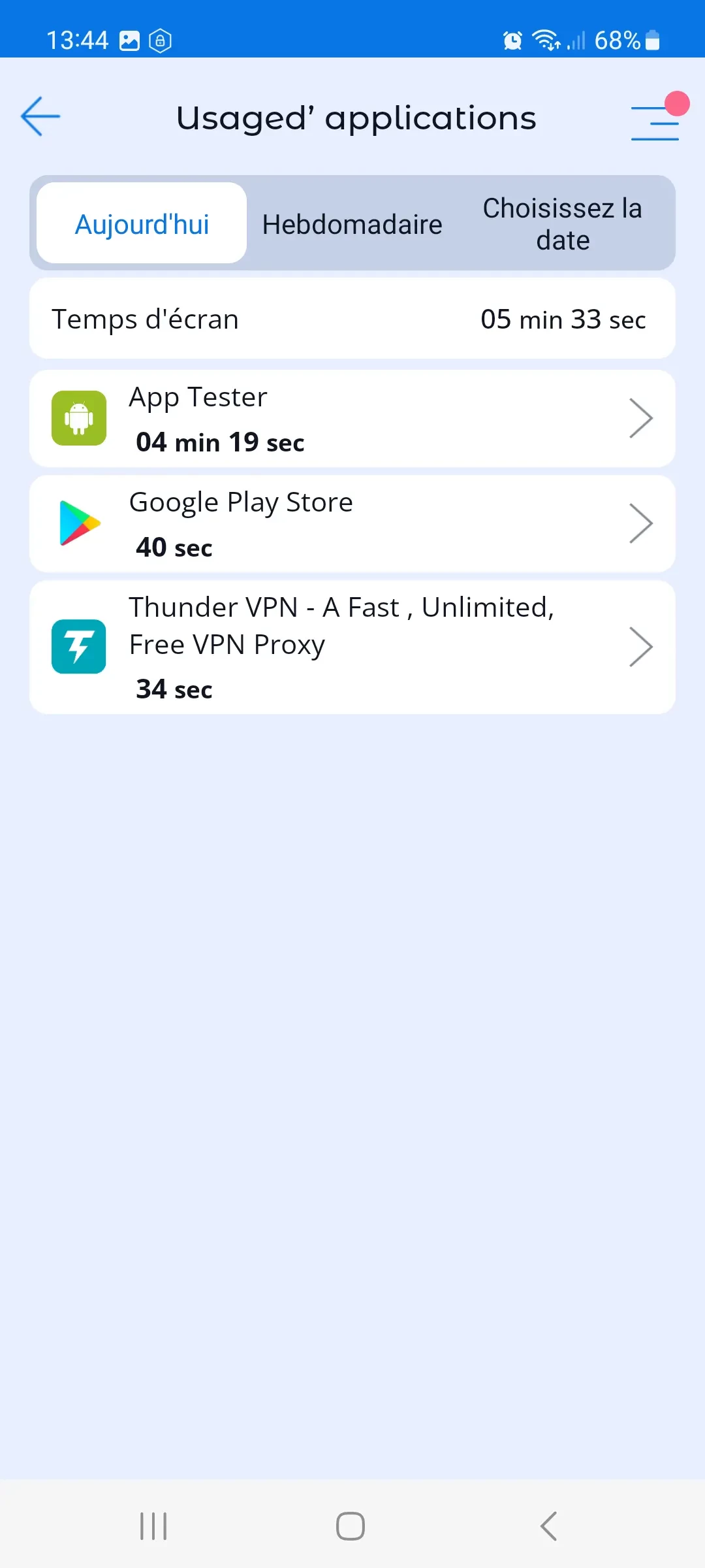 - Voir les statistiques du temps d'utilisation total de l'application pour le dernier jour ou une date sélectionnée;