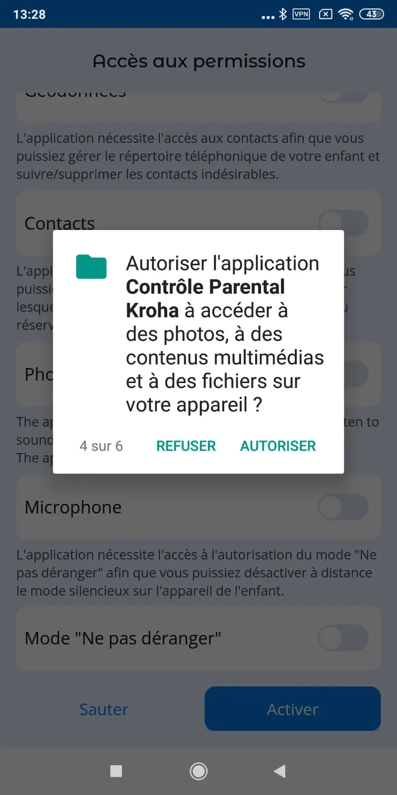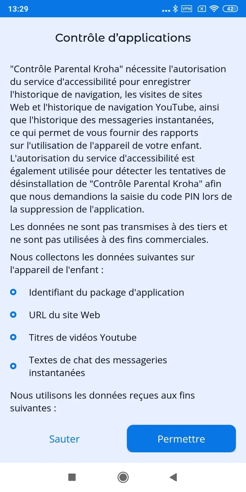 Pour que l'Aplicación de control parental Kroha fonctionne correctement, vous devez définir les autorisations lors de la connexion de l'appareil de votre enfant à votre compte.