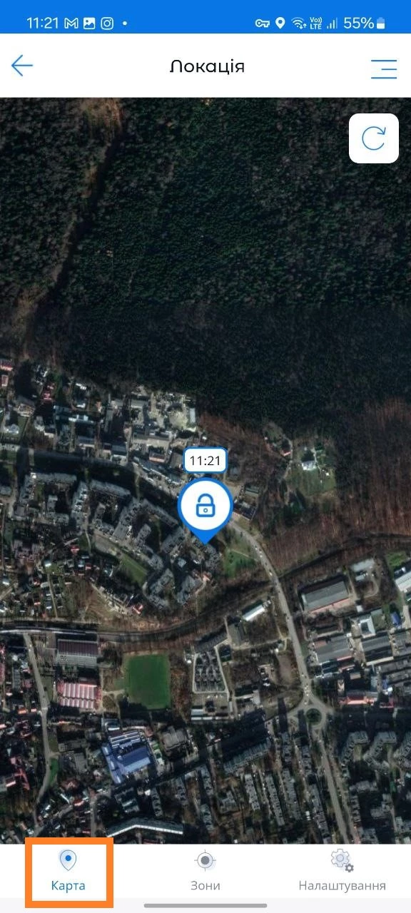 Nell'angolo in basso a sinistra della sezione "Localizzazione" dello schermo dello smartphone, è possibile vedere l'orario e la data dell'ultimo aggiornamento della geolocalizzazione del bambino. Se i dati risultano obsoleti, è necessario premere il pulsante "Aggiorna". Accedendo alle impostazioni, è possibile modificare la modalità di visualizzazione della mappa: ibrida, satellitare o standard.