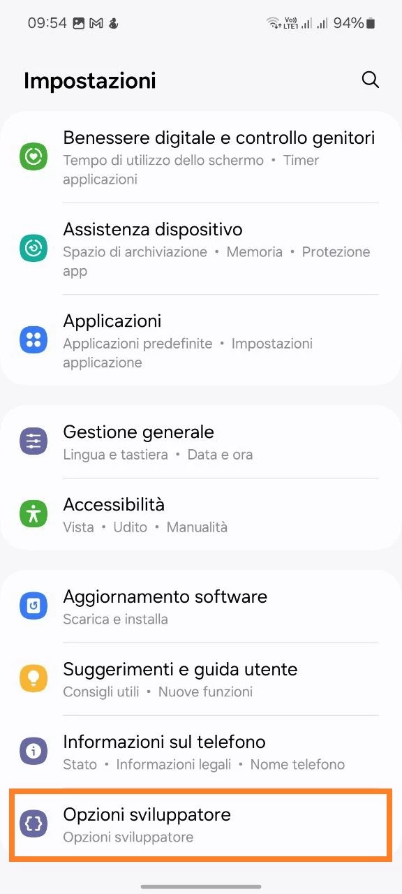 Successivamente, per accedere alle opzioni sviluppatore: