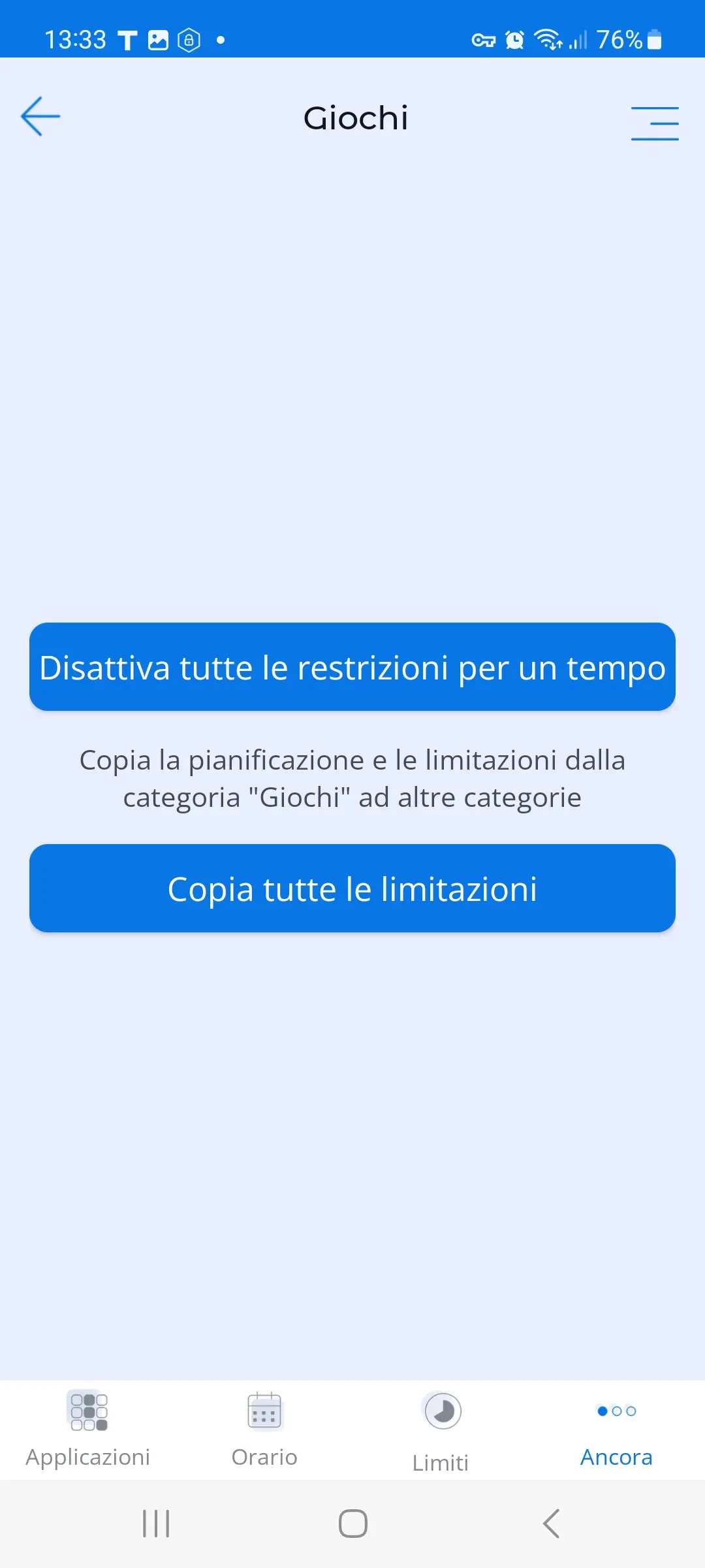 Se il limite è stato raggiunto e i genitori desiderano concedere ulteriore tempo di gioco al bambino, premendo l'opzione “Disabilita tutti i limiti di tempo” nel menu aggiuntivo “Altro” è possibile disattivare i blocchi per un periodo qualsiasi. Per una facile personalizzazione, nello stesso menu è possibile duplicare i limiti impostati anche per altre categorie.