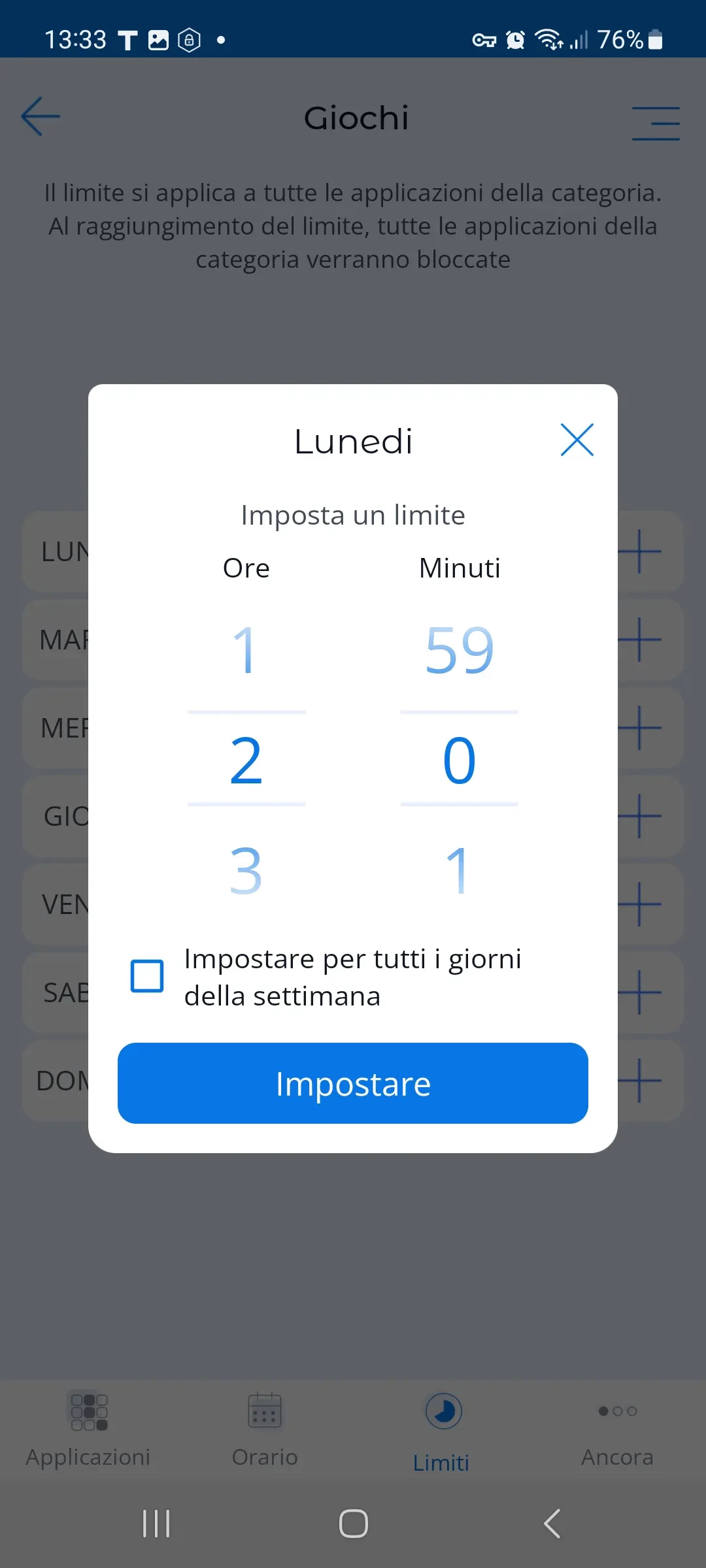Per impostare il limite, clicca sul pulsante ‘+’ accanto al giorno della settimana interessato e specifica il tempo consentito per l'uso di questa categoria ogni giorno. Puoi selezionare l'opzione “Imposta per tutti i giorni della settimana” e il limite verrà applicato a tutti i giorni contemporaneamente.