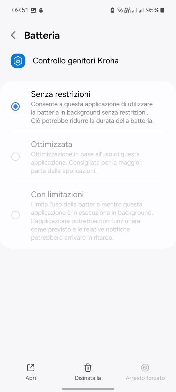 Come far funzionare in background l'app Kroha per il controllo parentale su Samsung (Android 12 - 14)?