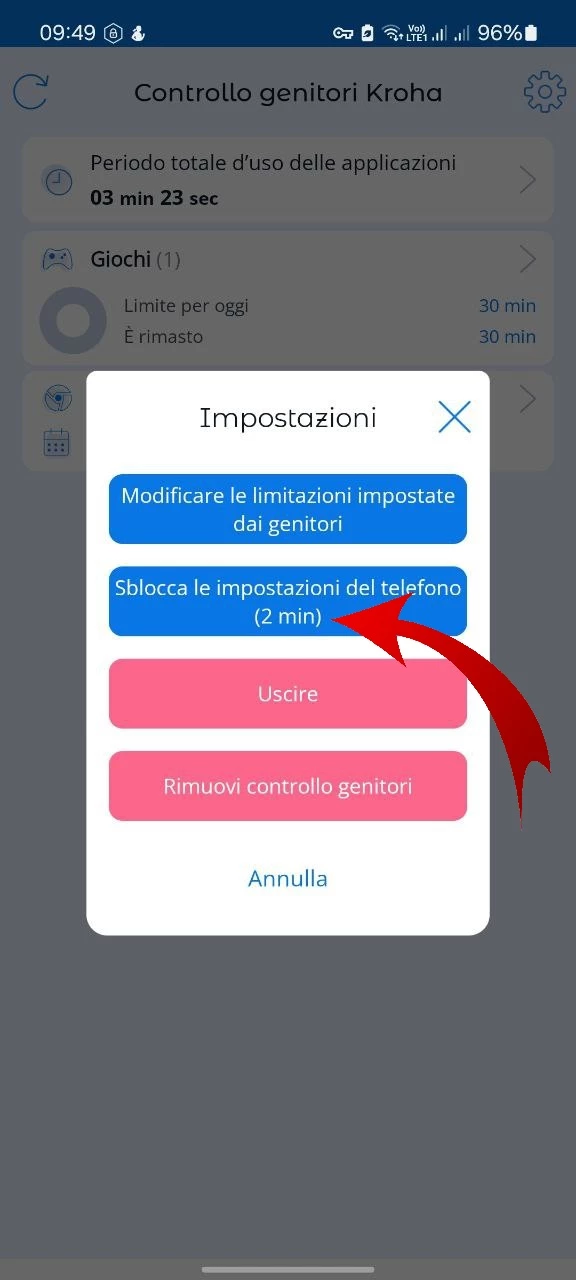 Quindi, apri l'app parental control Kroha sul dispositivo di tuo figlio > Tocca l'icona a forma di ingranaggio > Tocca “Disattiva temporaneamente per 2 minuti” > Inserisci il codice PIN. Questo per assicurarti che le impostazioni sul dispositivo di tuo figlio non siano bloccate per 2 minuti, in modo da poterle verificare.