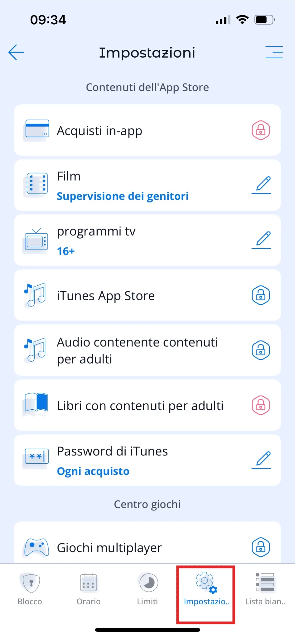 Questa scheda offre restrizioni aggiuntive per l'AppStore e il Game Centre. Ad esempio, vi sono opzioni per bloccare gli acquisti in-app, iTunes, ecc.