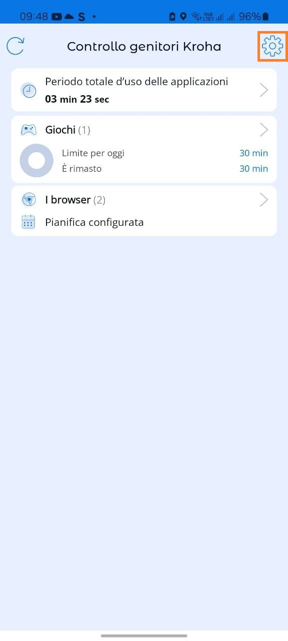 Quindi, apri l'app parental control Kroha sul dispositivo di tuo figlio > Tocca l'icona a forma di ingranaggio > Tocca “Disattiva temporaneamente per 2 minuti” > Inserisci il codice PIN. Questo per assicurarti che le impostazioni sul dispositivo di tuo figlio non siano bloccate per 2 minuti, permettendoti di controllarle.