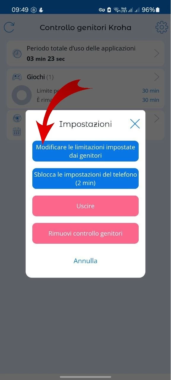 Prima, sul dispositivo di tuo figlio, apri l'app parental control Kroha > Tocca l'icona dell'ingranaggio > Tocca “Modifica restrizioni parentali” > Inserisci il codice PIN > Se appare una guida di configurazione, seguila.