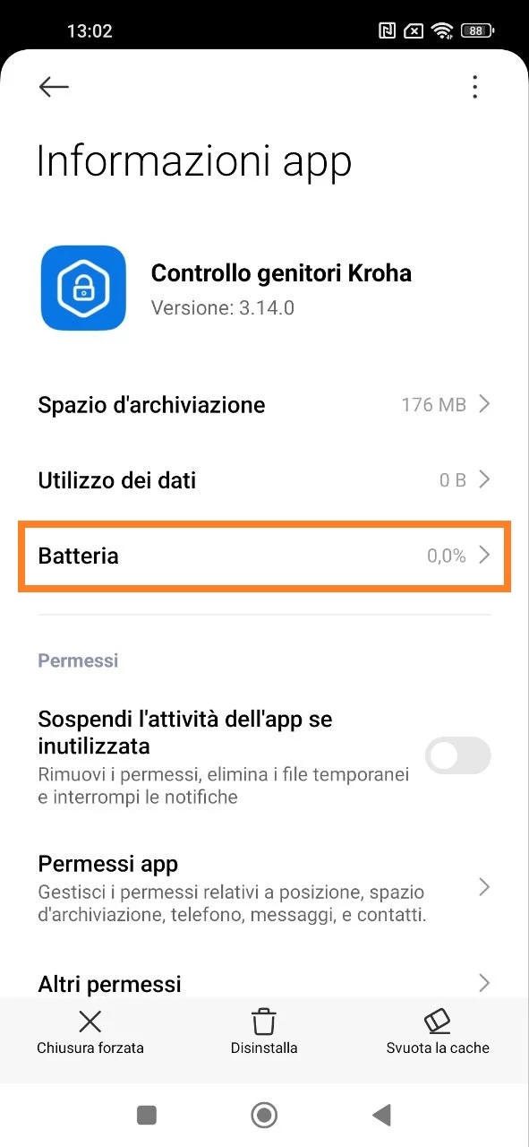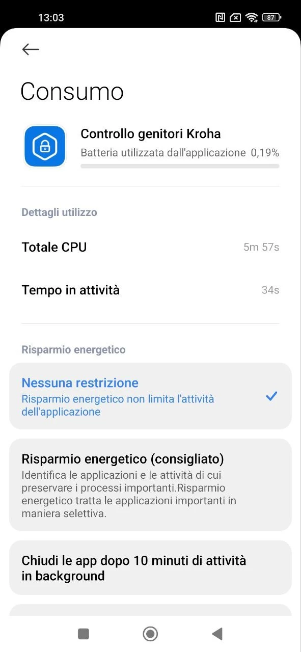 - Impostazioni di risparmio energetico: apri l'app Impostazioni sul dispositivo di tuo figlio > Apri App > Gestisci app > Trova l'app parental control Kroha > Apri Risparmio batteria > Seleziona "Non limitare".