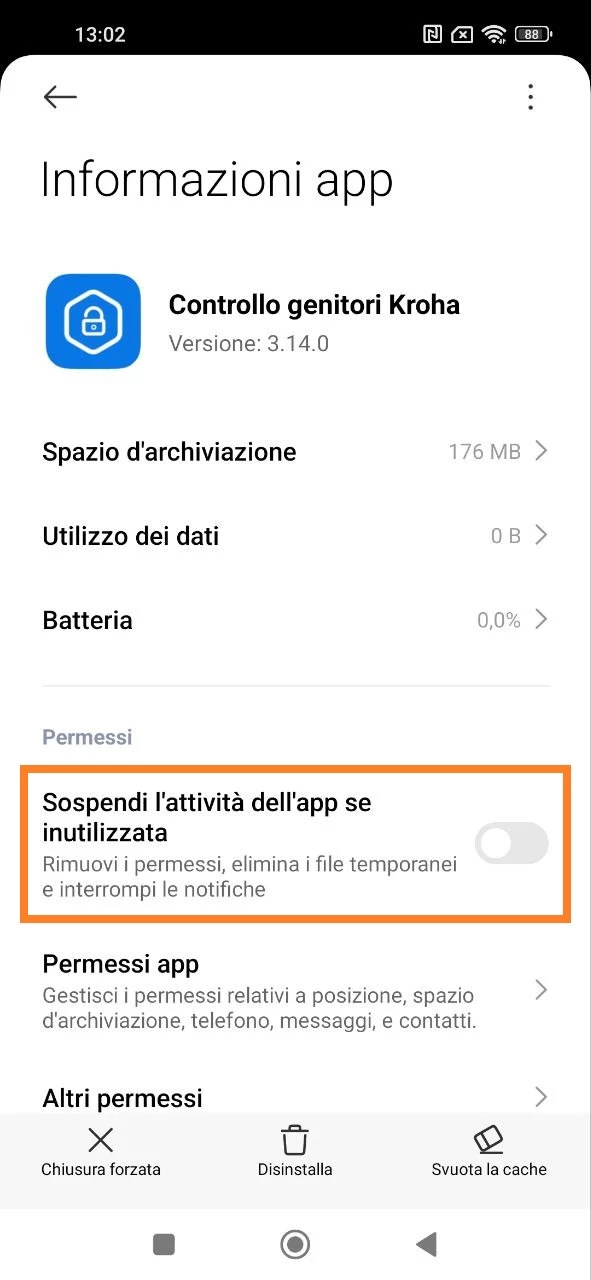 - Apri l'app Impostazioni sul dispositivo di tuo figlio > Apri la sezione App > Gestisci app > Trova l'app parental control Kroha > Disattiva l'interruttore accanto a "Pausa l'app quando non in uso".