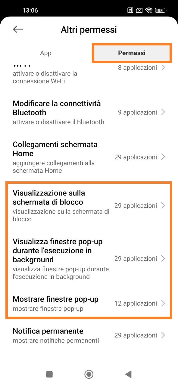 - Apri l'app Impostazioni sul dispositivo di tuo figlio > Apri la sezione App > Autorizzazioni > Altre autorizzazioni > Scheda autorizzazioni > Vai su Blocco schermo, Mostra pop-up durante l'esecuzione in background, Autorizzazioni popup uno per uno e abilita le autorizzazioni per l'app parental control Kroha.
