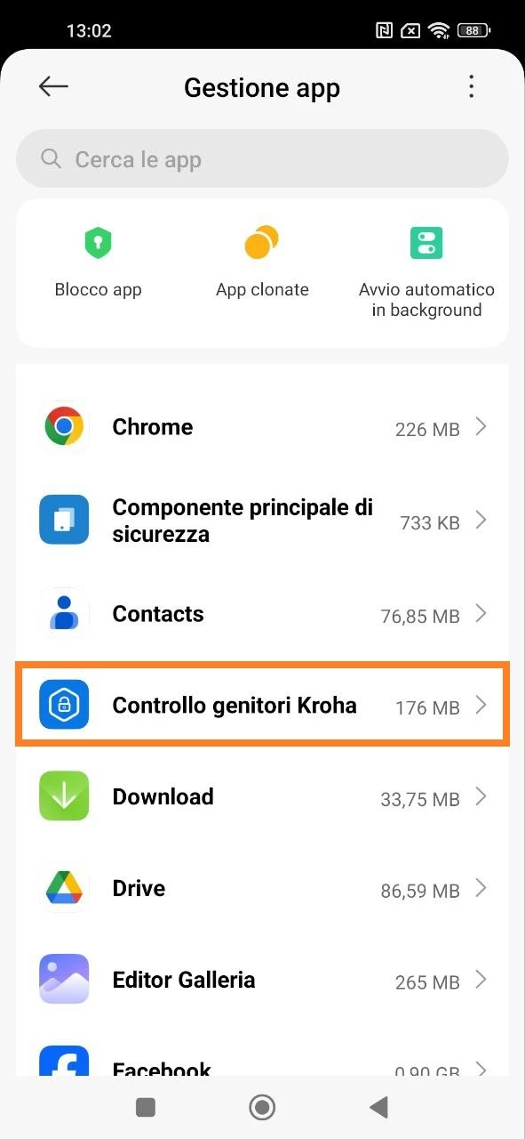 - Impostazioni di avvio automatico: apri l'app Impostazioni sul dispositivo di tuo figlio > Apri la sezione App > Gestisci app > Avvio automatico in background > Trova l'app parental control Kroha > Attiva l'interruttore.