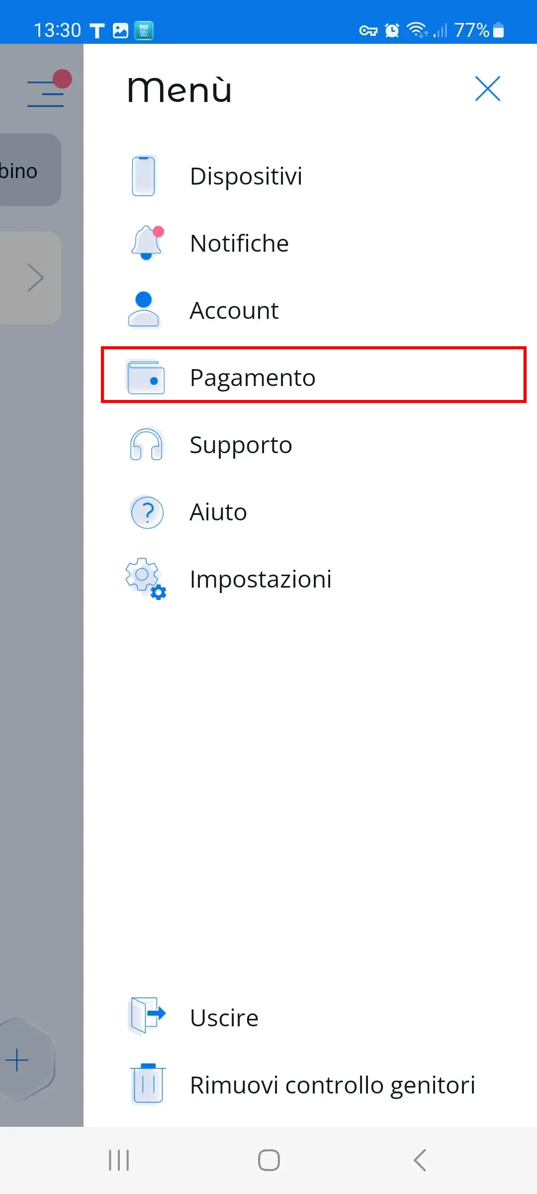 - Fare clic sull'icona del menu in alto a destra, selezionare Pagamento;