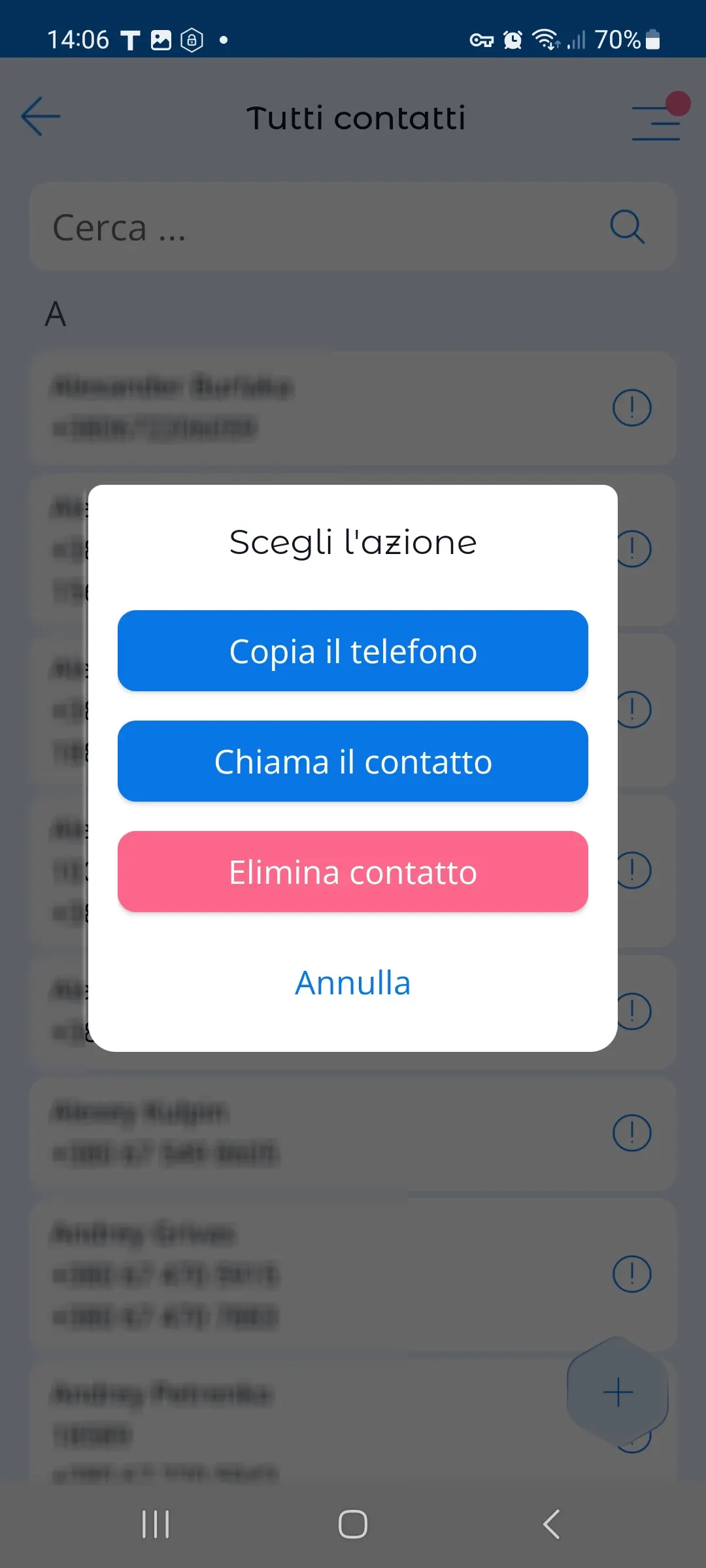 Per eliminare o copiare, tocca l'icona "!" accanto a ciascun contatto.