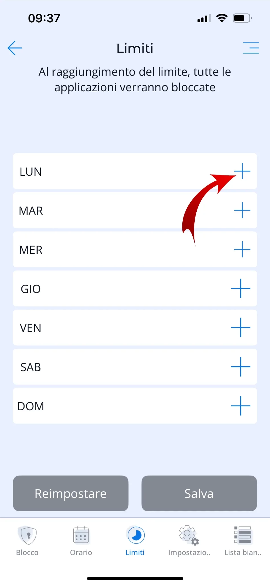 Clicca sul “+” accanto al giorno della settimana desiderato e stabilisci un tempo sufficiente per far giocare tuo figlio ogni giorno. Per tua comodità, puoi impostare gli stessi limiti per tutti i giorni della settimana in una volta selezionando l’opzione "Imposta per tutti i giorni della settimana". Le app della categoria selezionata saranno disponibili per il limite specificato e, una volta scaduto, verranno bloccate.