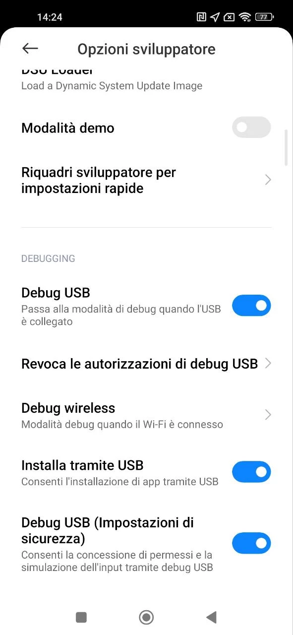 Nota che su alcuni dispositivi, oltre all'interruttore "Debug via USB", sono presenti gli interruttori "Setup via USB" e "Debug via USB (impostazioni di sicurezza)" nelle opzioni sviluppatore. Se trovi questi interruttori sul dispositivo del bambino, attivali.