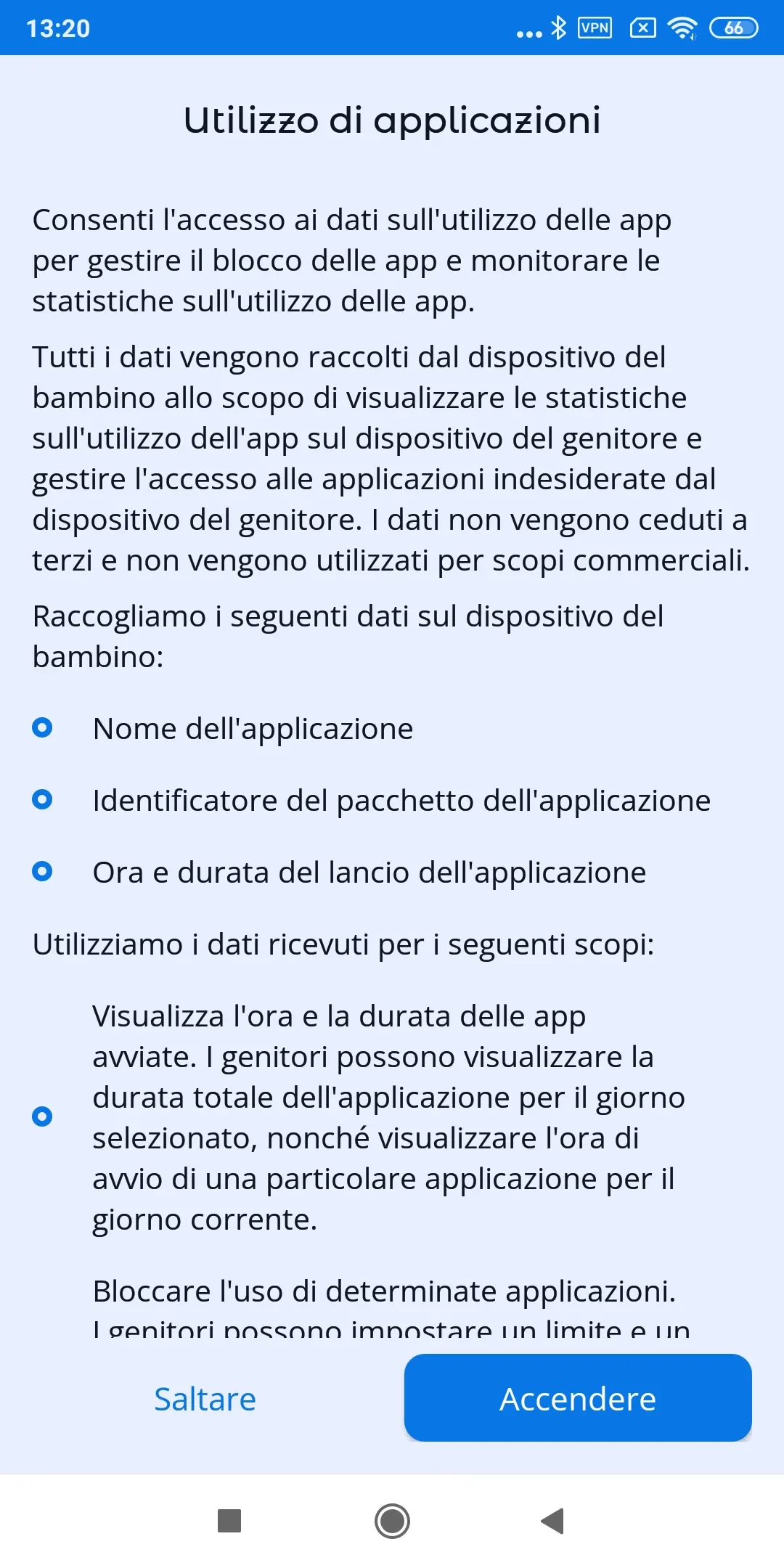 "Monitoraggio app": attiva la funzione di monitoraggio app se desideri limitare o bloccare le app sul telefono del tuo bambino; leggi la guida passo dopo passo per ulteriori dettagli e tocca "Consenti";