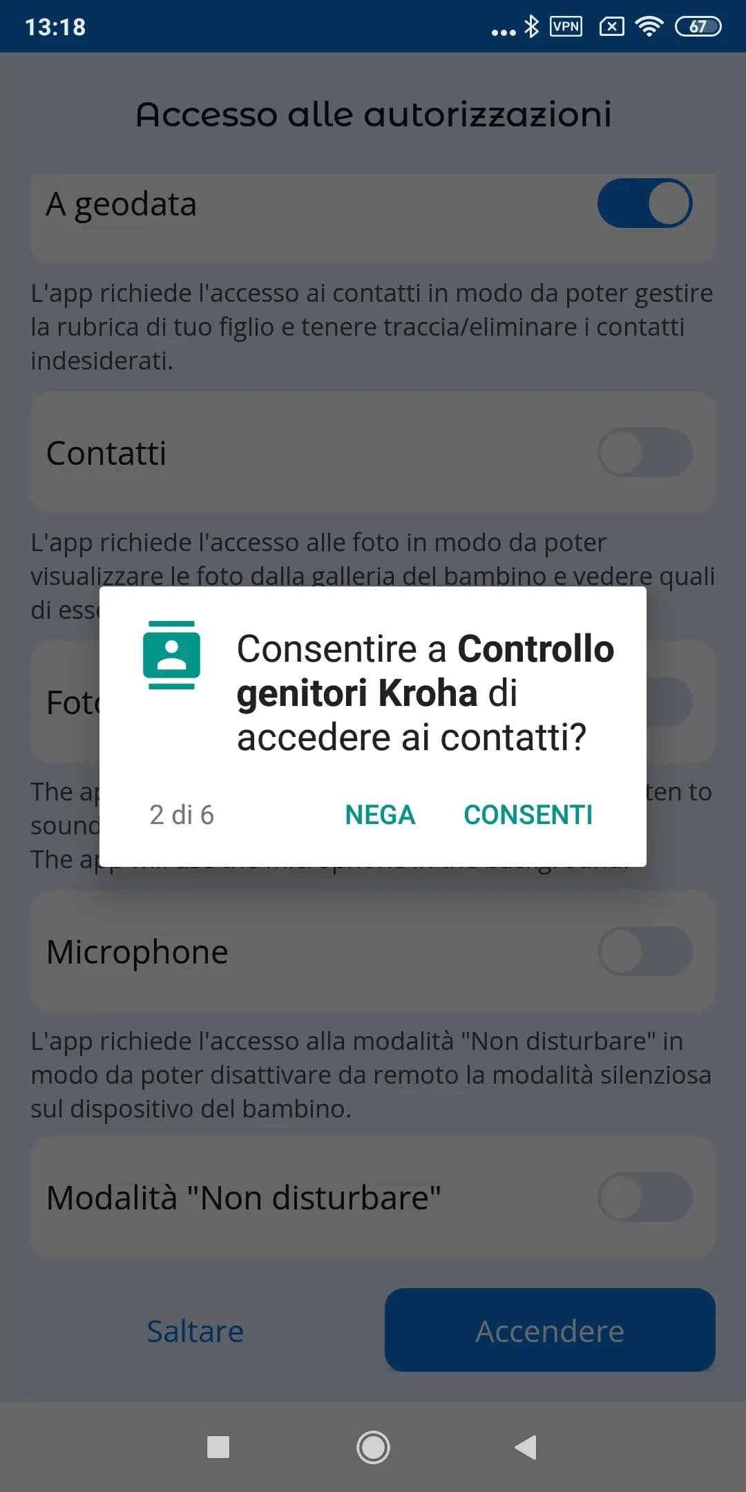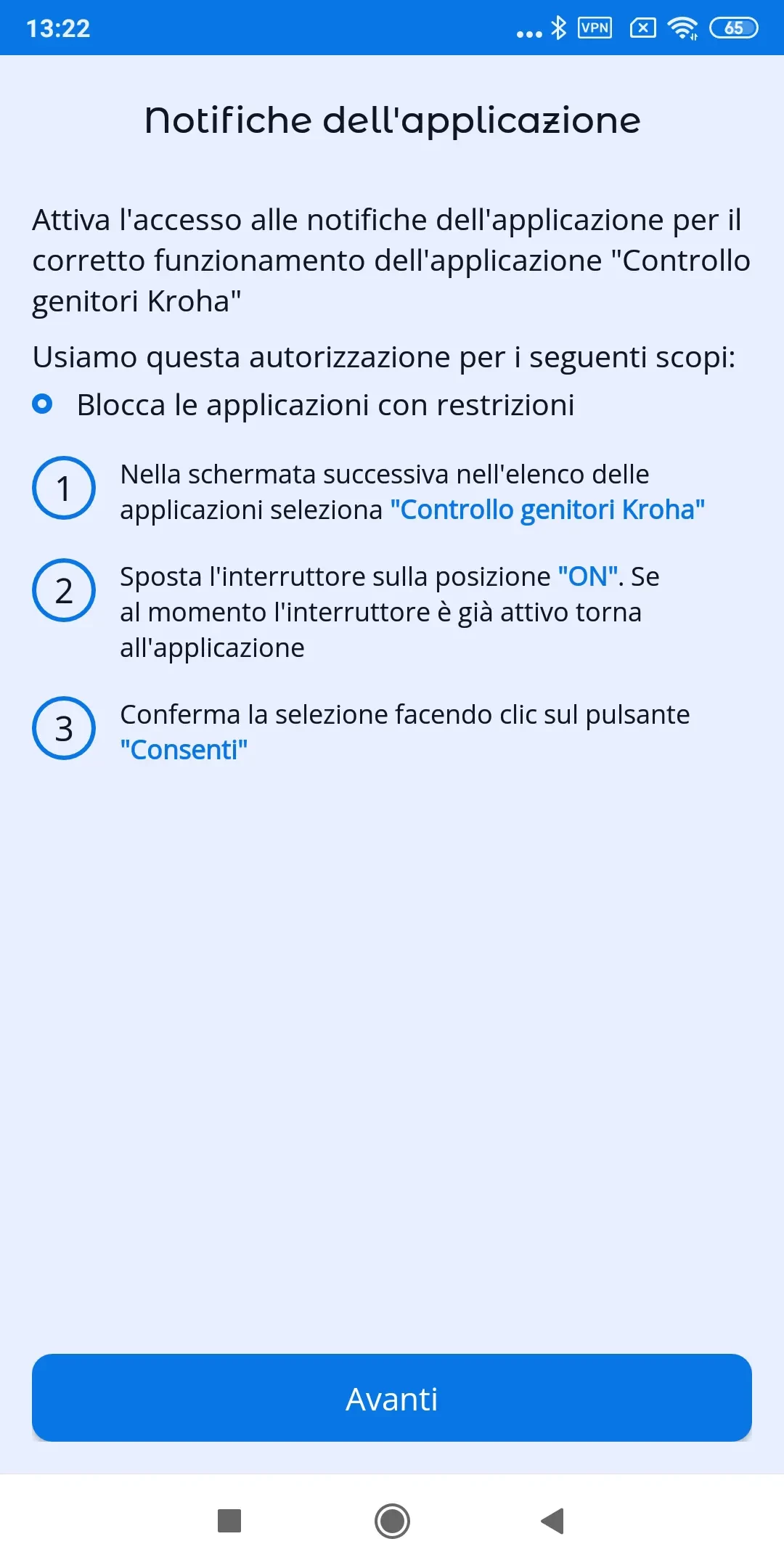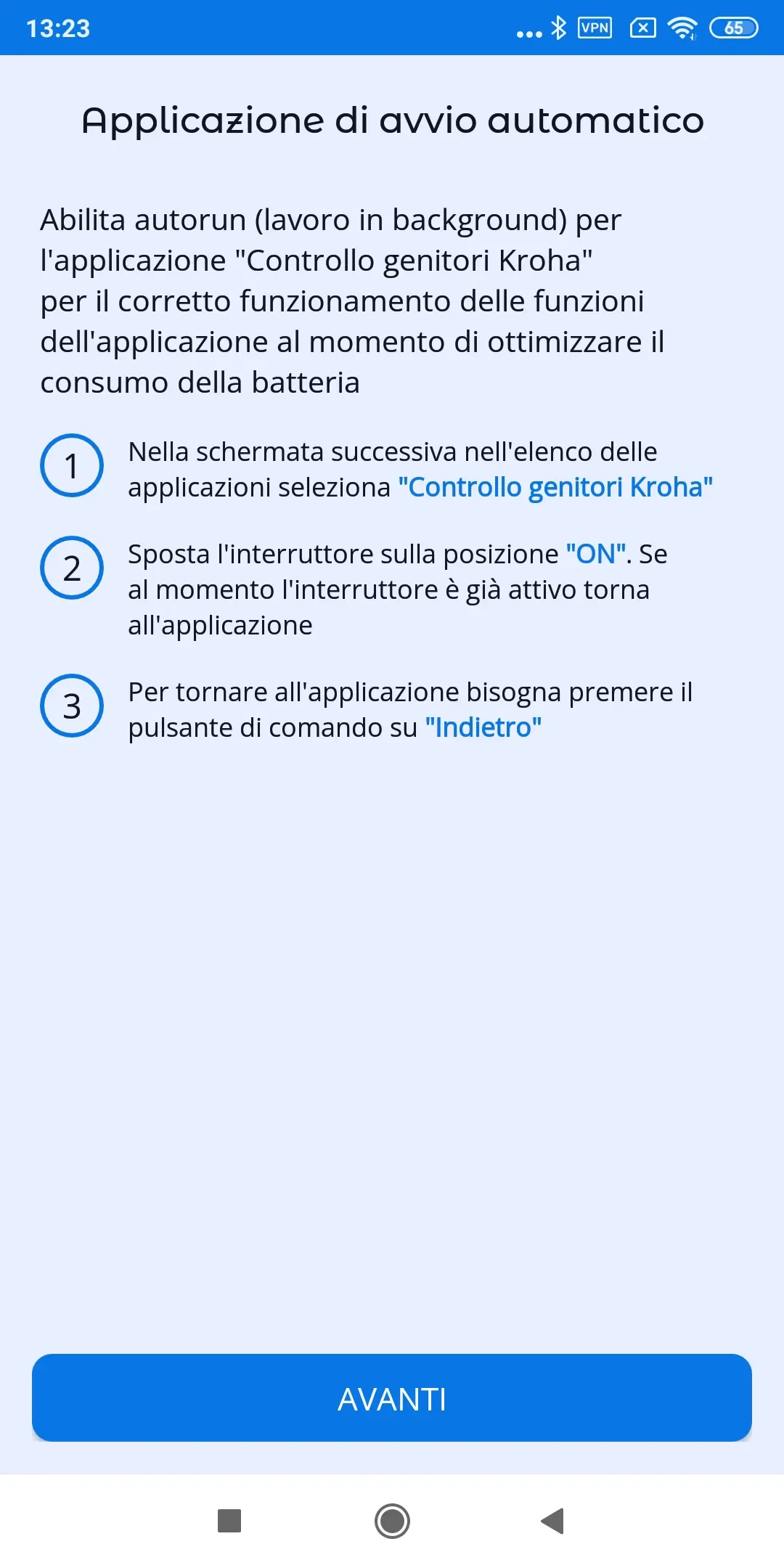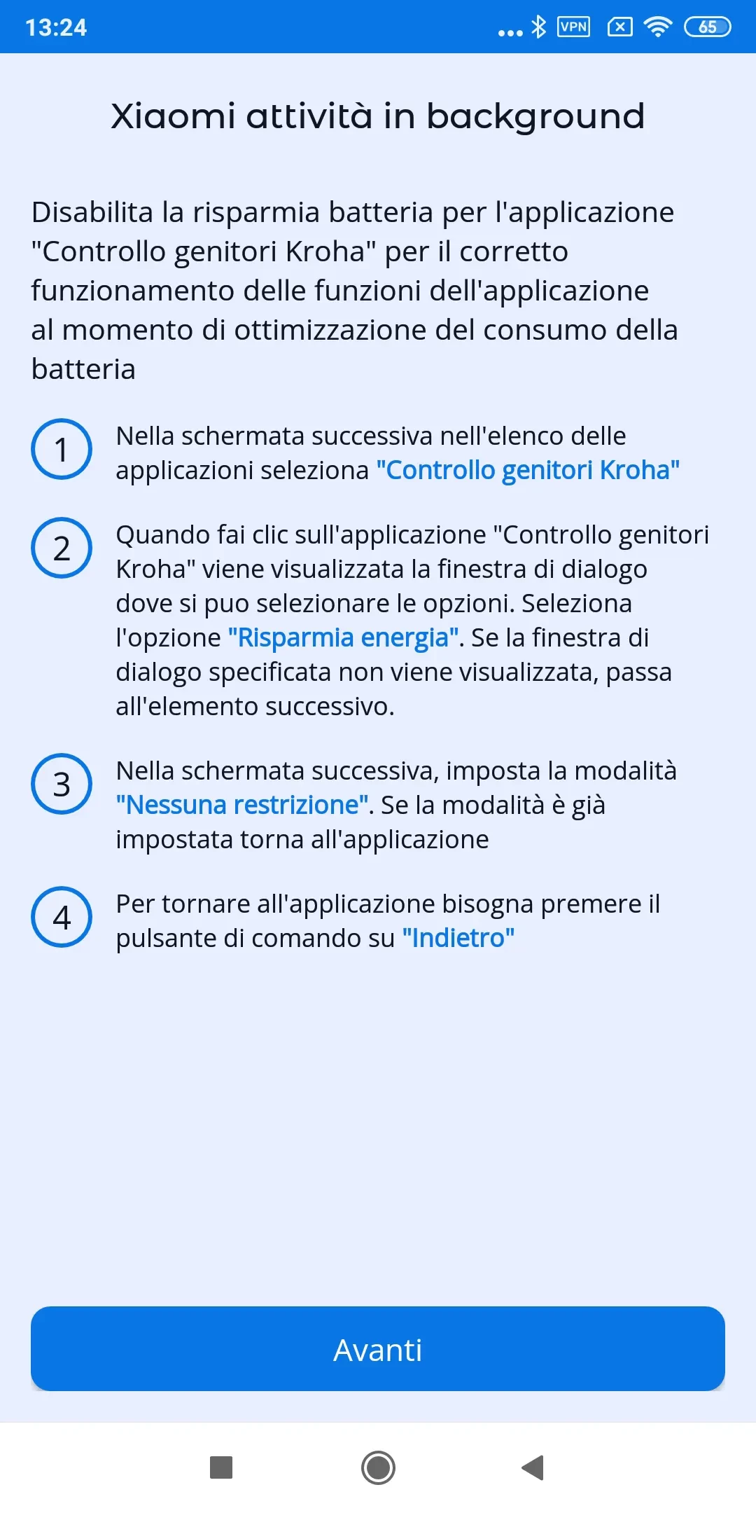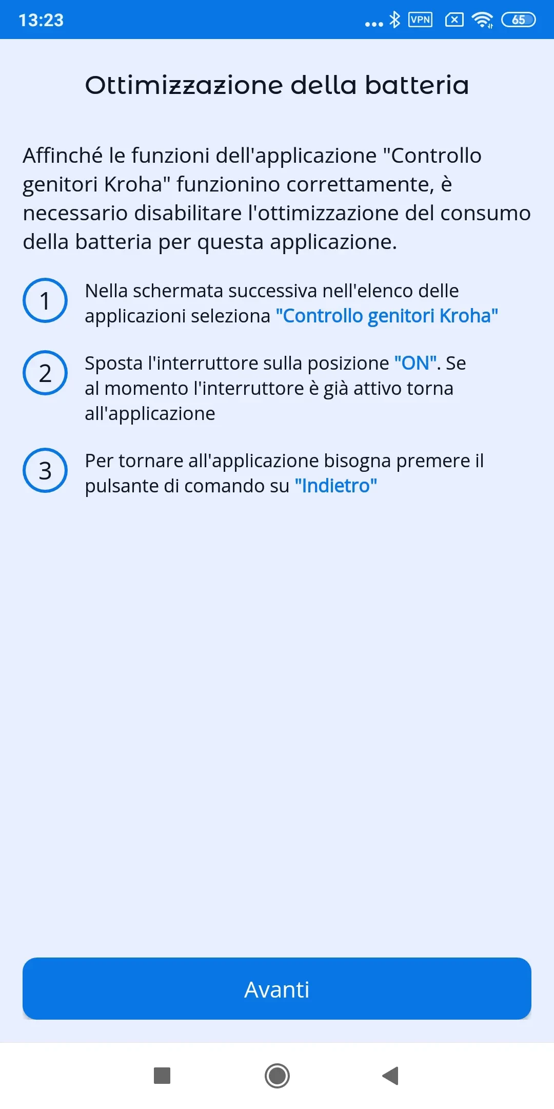 "Ottimizzazione batteria": per il corretto funzionamento dell'app è necessario disabilitare l'ottimizzazione della batteria per l'app di controllo parentale Kroha; leggi la guida passo dopo passo per ulteriori dettagli e tocca "Avanti";