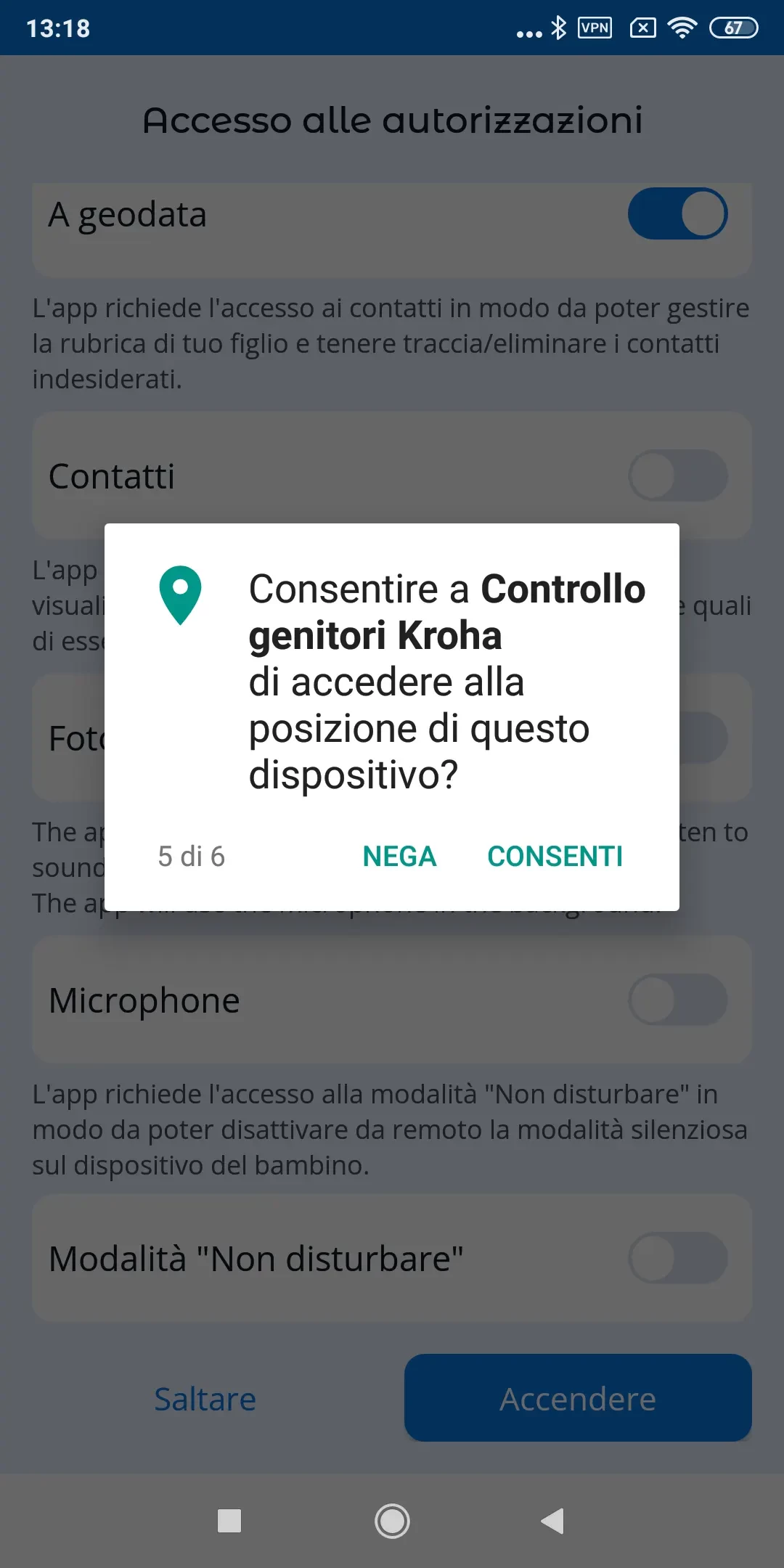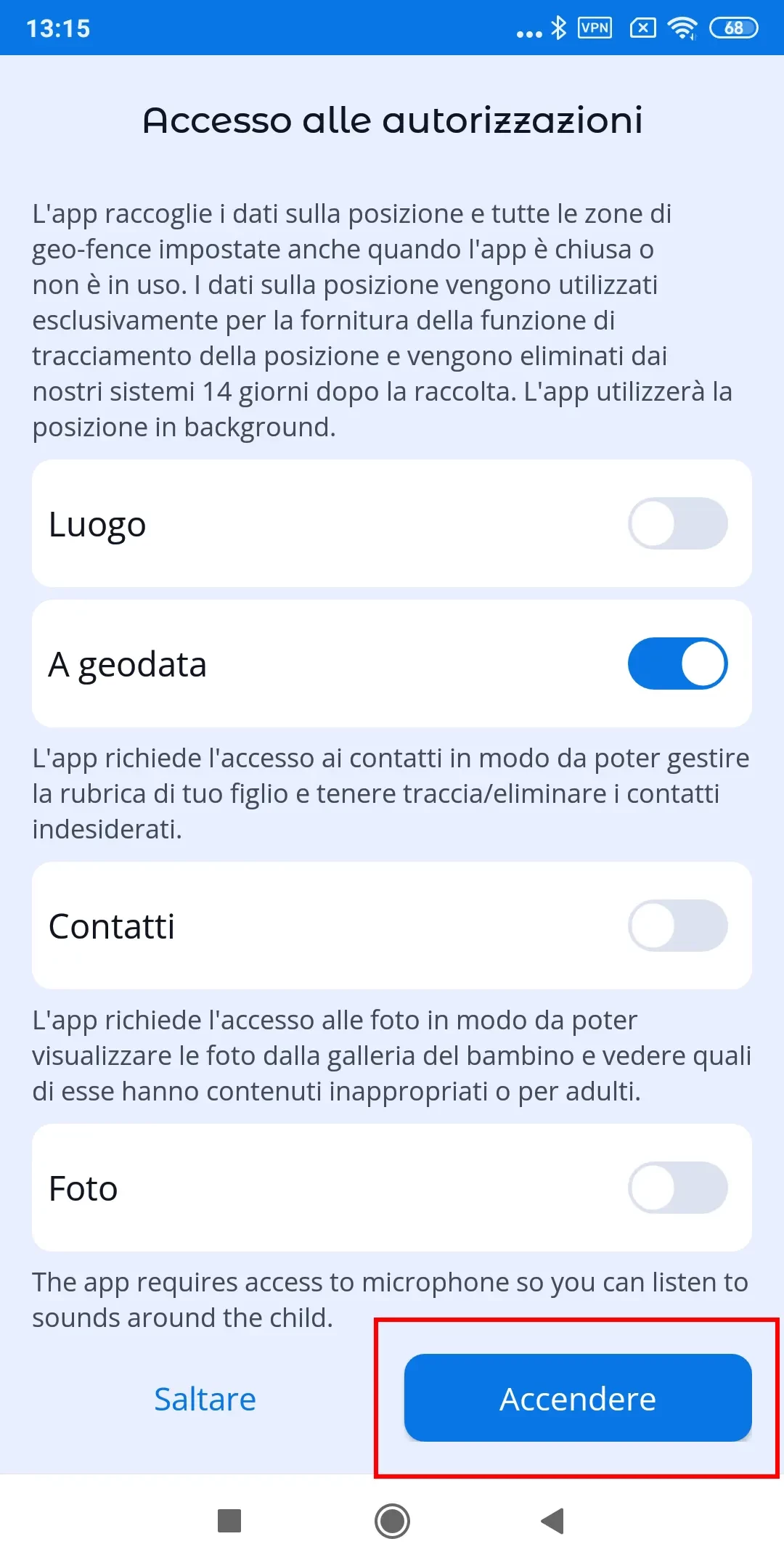 Per far funzionare correttamente l'app, è necessario impostare le autorizzazioni quando si collega il dispositivo del bambino al tuo account.