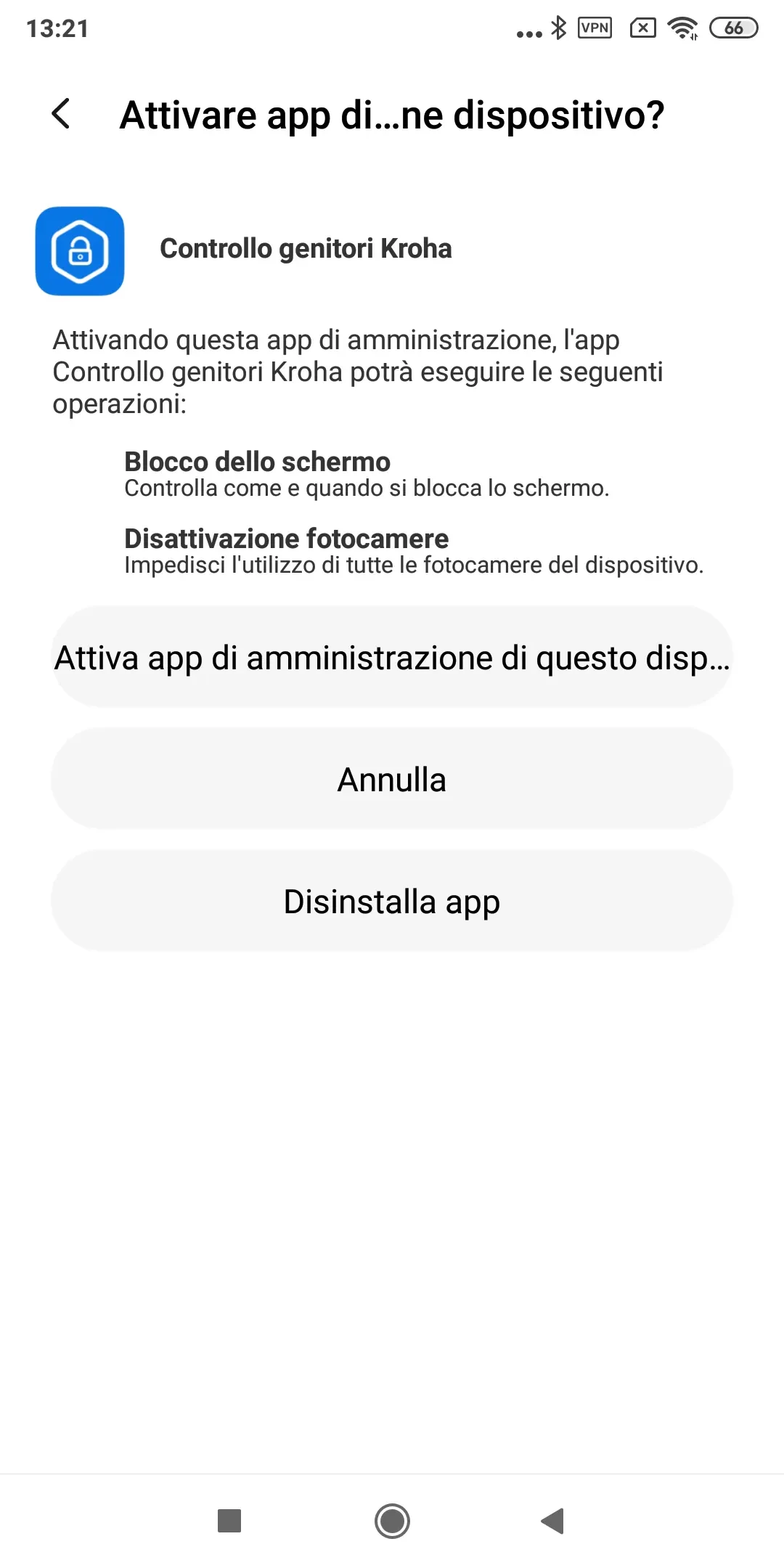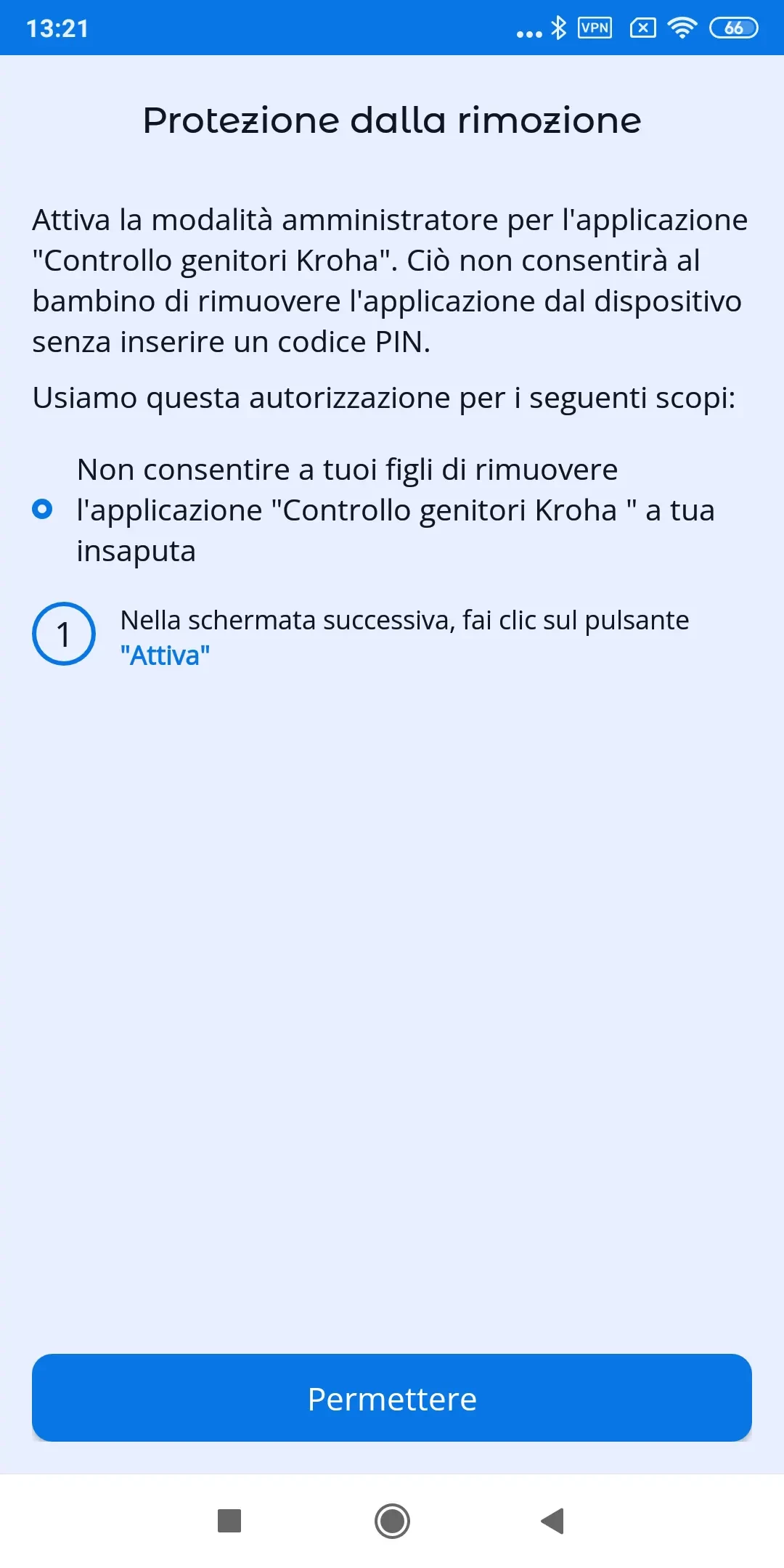 "Protezione disinstallazione": attiva la modalità amministratore per l'app di controllo parentale Kroha. In questo modo impedirai al tuo bambino di eliminare l'app dal dispositivo senza inserire il codice PIN; leggi la guida passo dopo passo per ulteriori dettagli e tocca "Consenti";