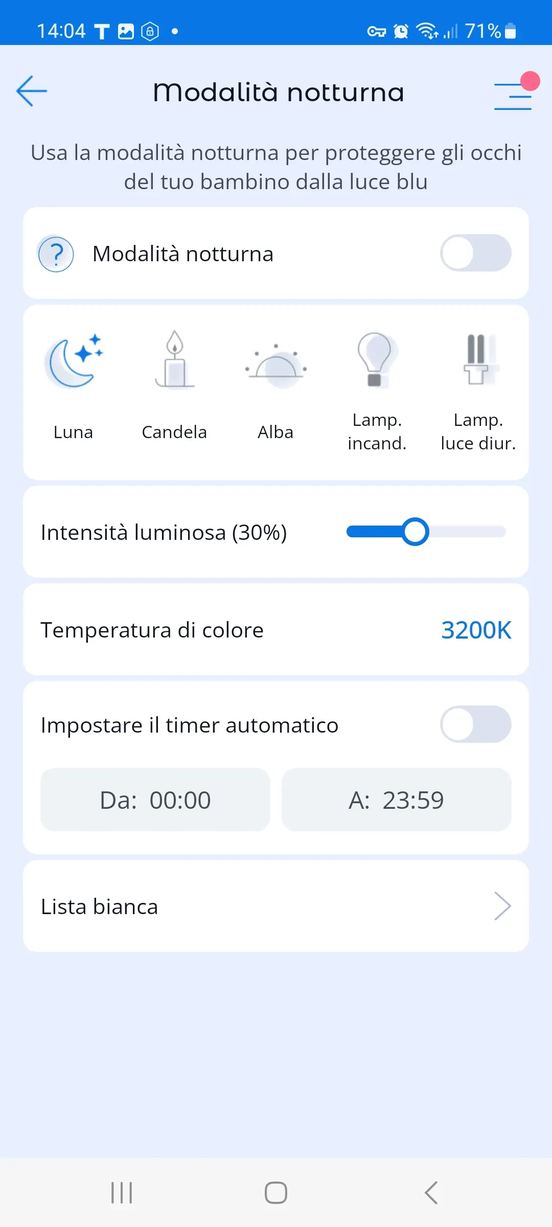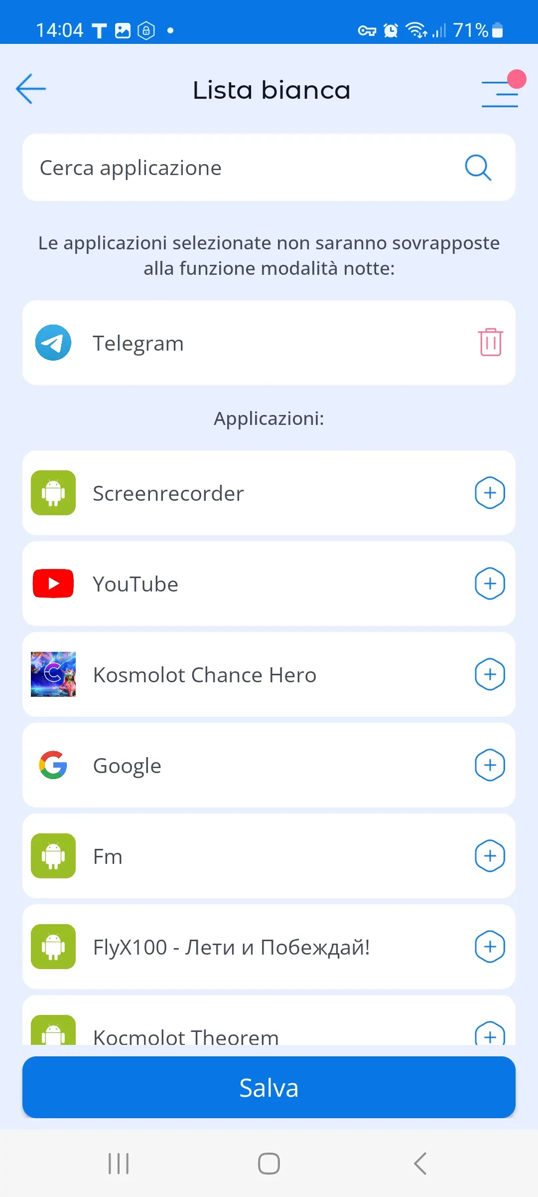 Whitelist: se non vuoi che la funzionalità di modalità notte si attivi per determinate app, puoi aggiungerle a una whitelist e la modalità notte verrà disattivata quando tali app saranno avviate.
