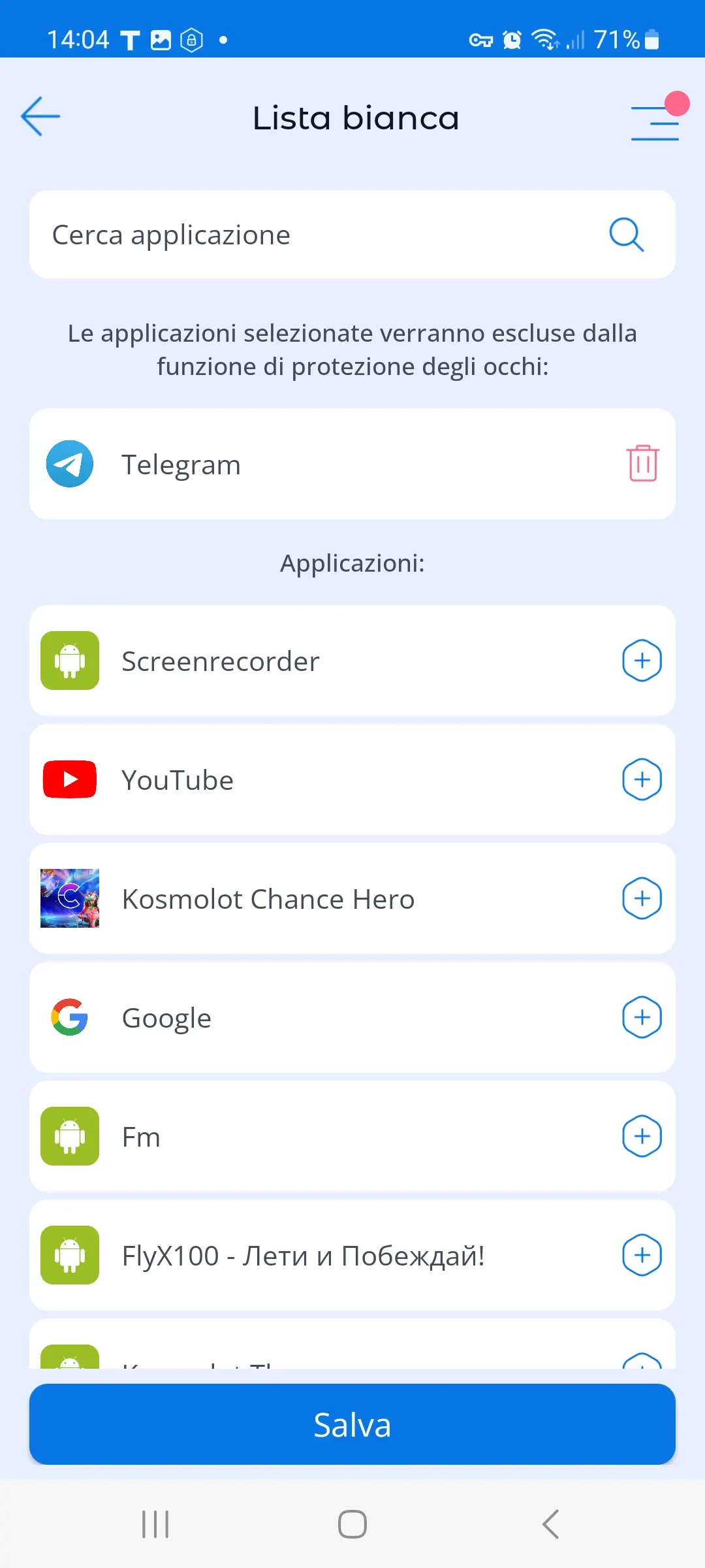 Lista bianca: Se non desideri che la Protezione degli Occhi blocchi determinate app, puoi aggiungerle a una lista bianca e lo schermo non si bloccherà quando queste app verranno avviate.