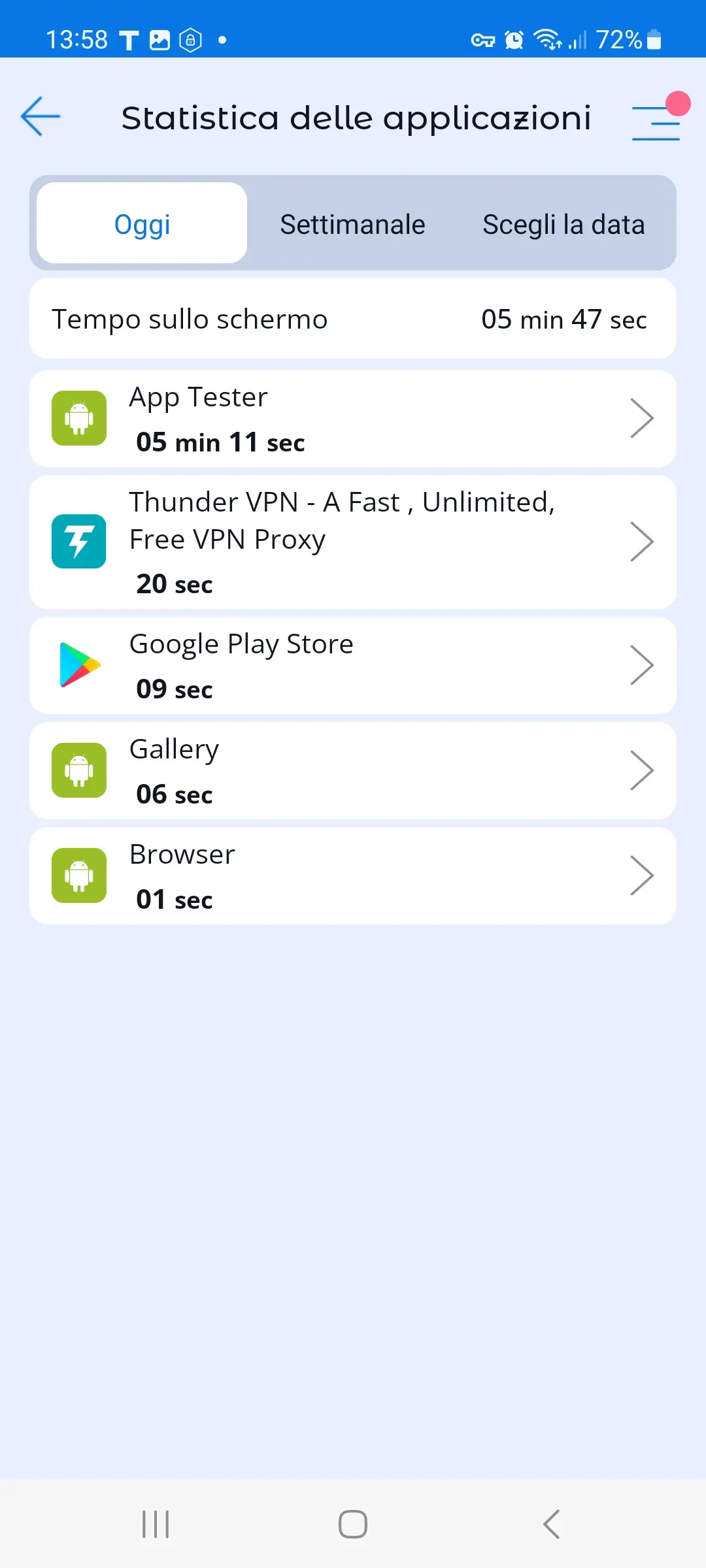 - Visualizza le statistiche del tempo totale di utilizzo delle app per l'ultimo giorno o per una data selezionata;