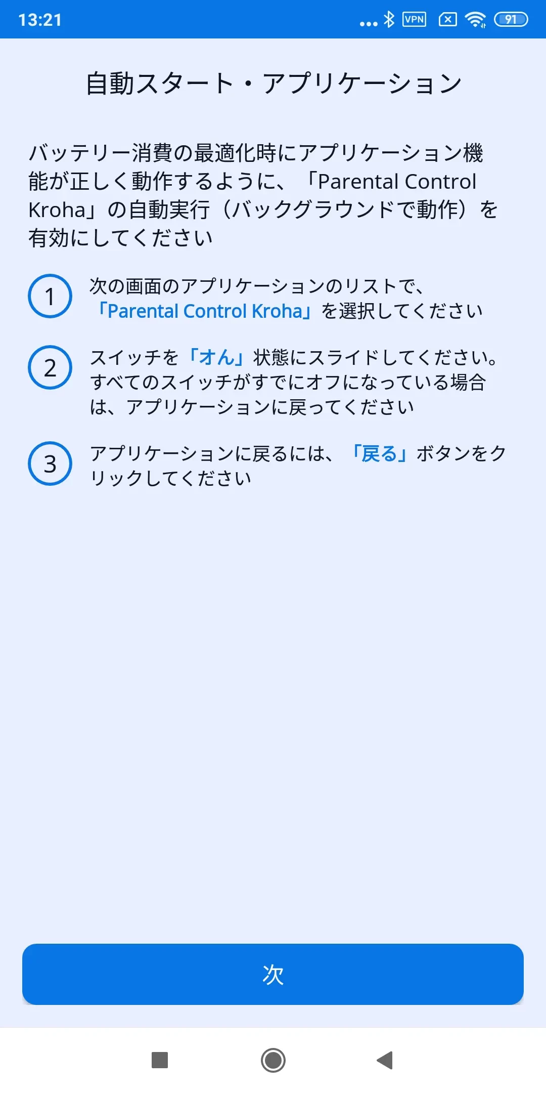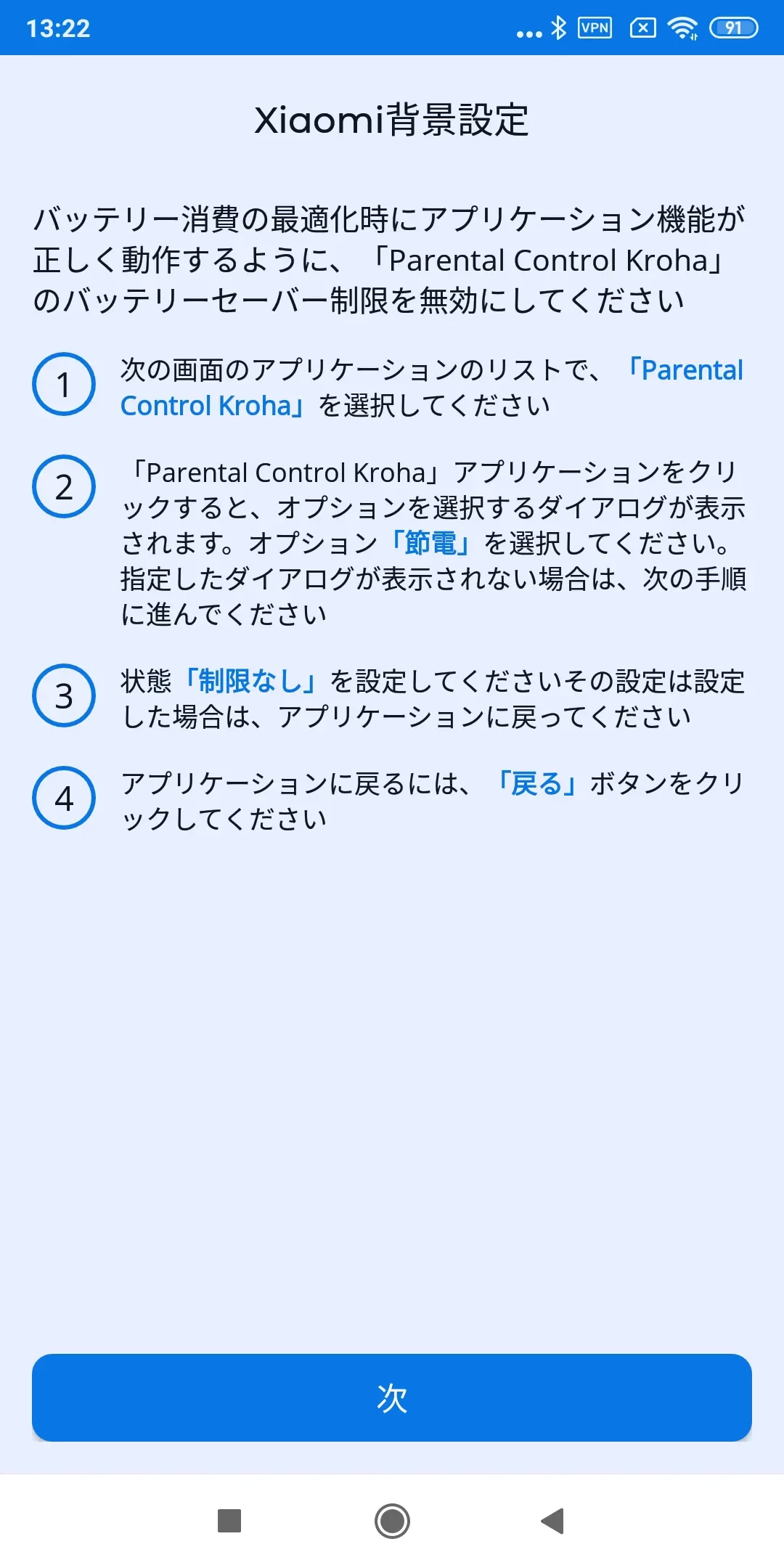「バッテリー最適化」:アプリが正しく動作するために、ペアレンタルコントロールアプリのバッテリー最適化を無効にする必要があります。詳細はステップバイステップガイドを読み、「次へ」をタップします;