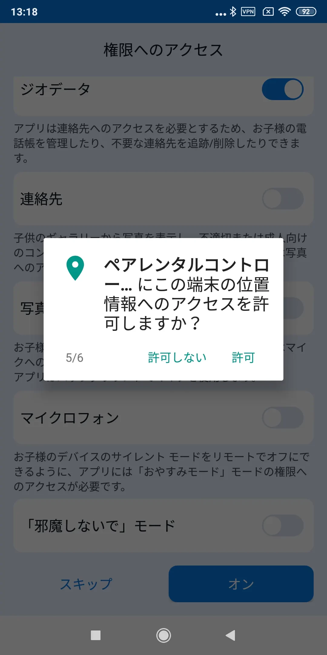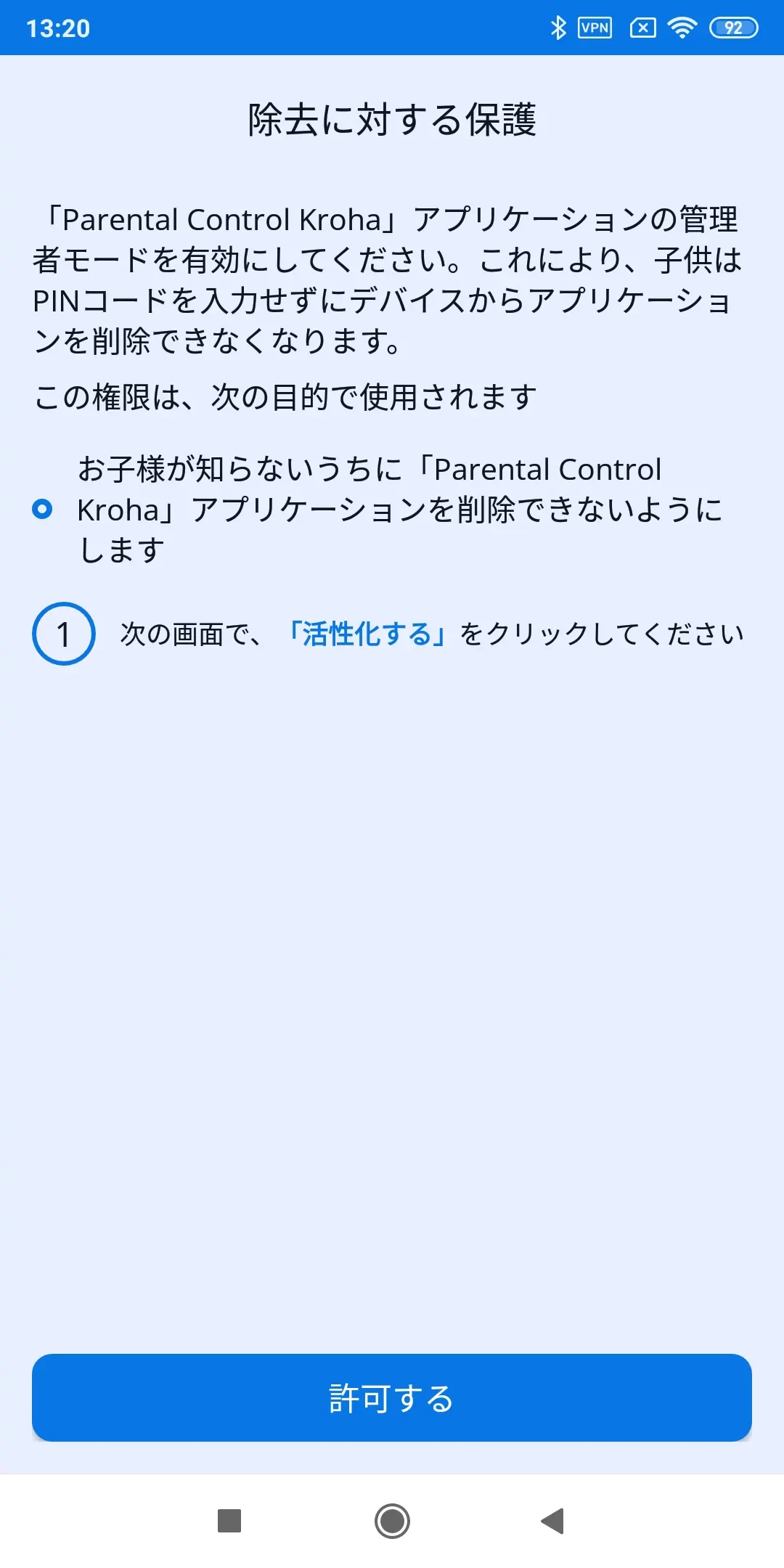 「アンインストール保護」:ペアレンタルコントロールアプリの管理者モードを有効にします。これにより、PINコードを入力せずに子供がデバイスからアプリを削除するのを防ぎます。詳細はステップバイステップガイドを読み、「許可」をタップします;