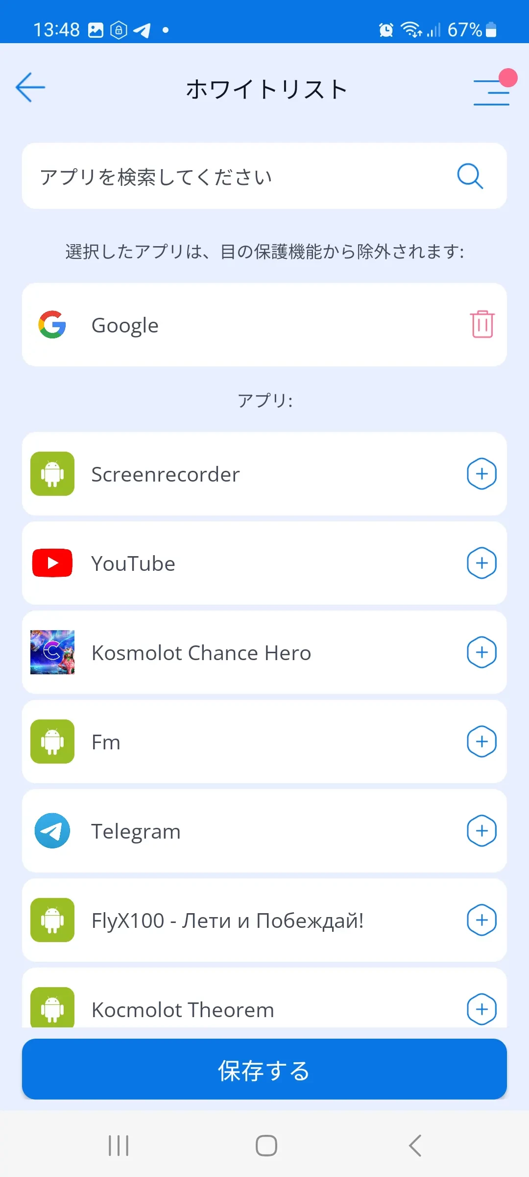 ホワイトリスト: アイプロテクションが特定のアプリをブロックしないようにしたい場合は、それらをホワイトリストに追加することができ、これらのアプリが起動された時に画面がロックされなくなります。