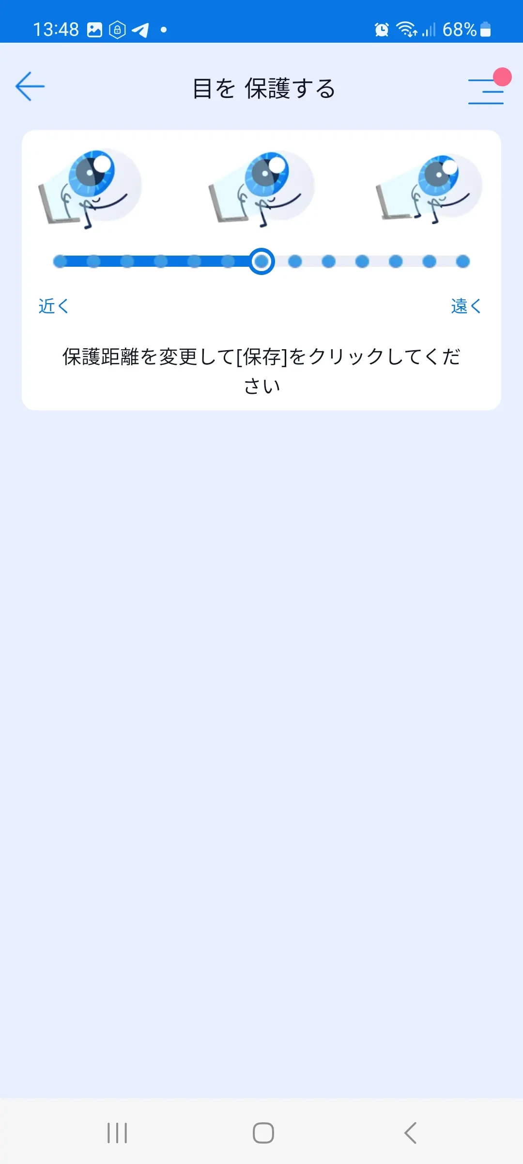 画面から目までの安全なデフォルトの距離は眼科医の推奨に基づき(30 cm)設定されています。親は、アイプロテクション画面の下部にあるスライダーでこの距離を調整することができます。