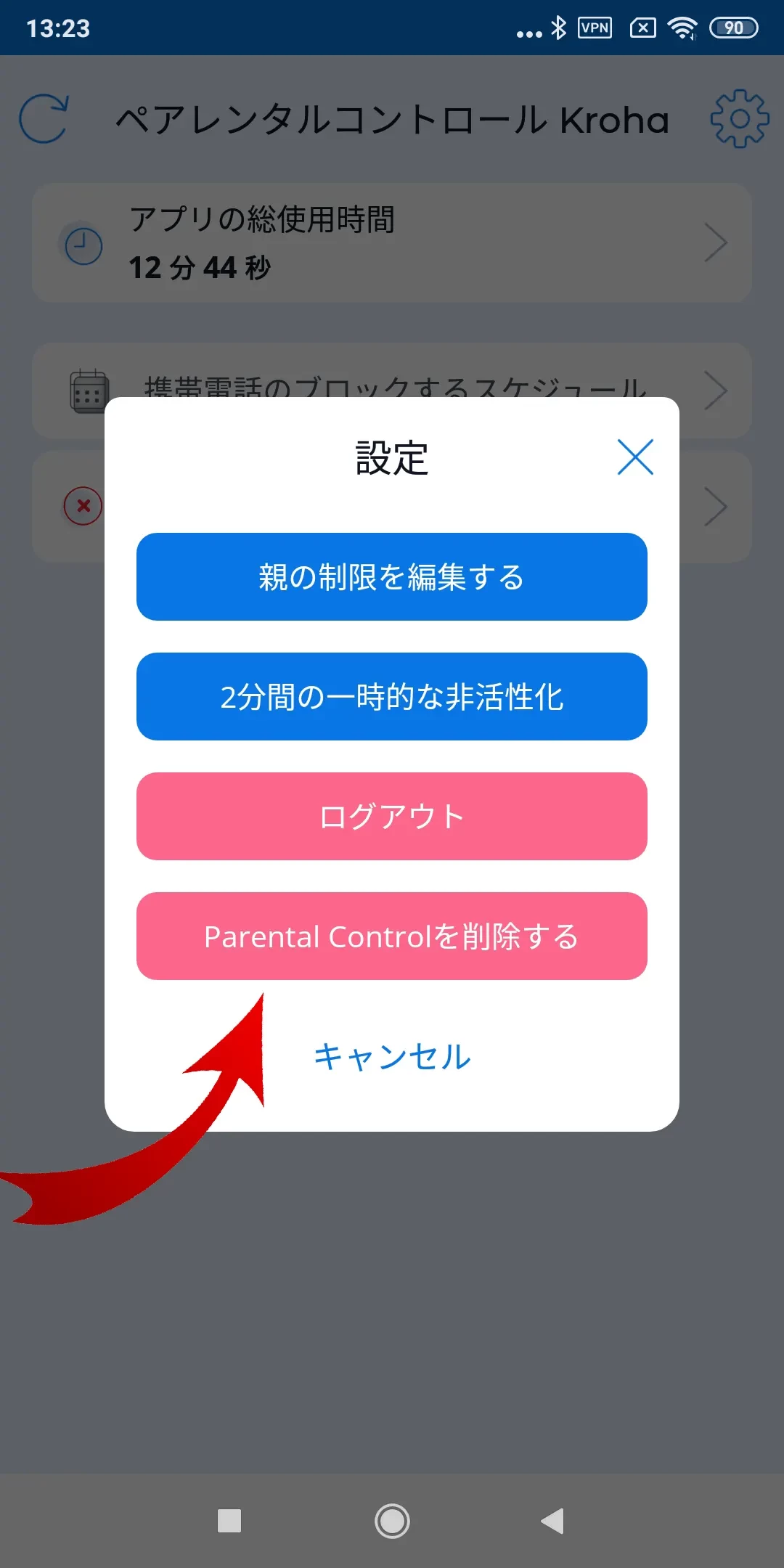 3. 「KrohaペアレンタルコントロールAndroidを削除」ボタンをクリックします。