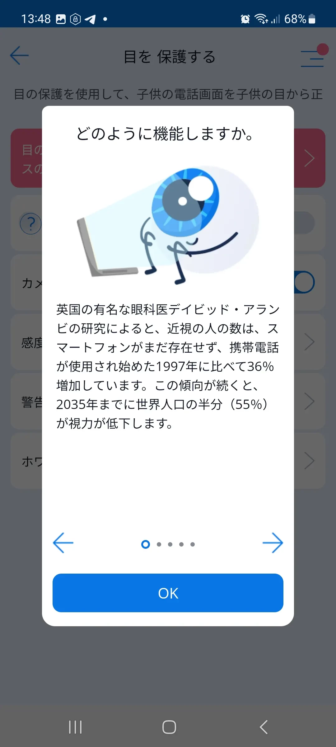 この機能は子供の目と画面の距離を監視し、画面が近すぎる場合は子供が画面を遠ざけるまで画面をロックします。子供がスマートフォンを目から遠ざけると、画面は自動的に解除されます。