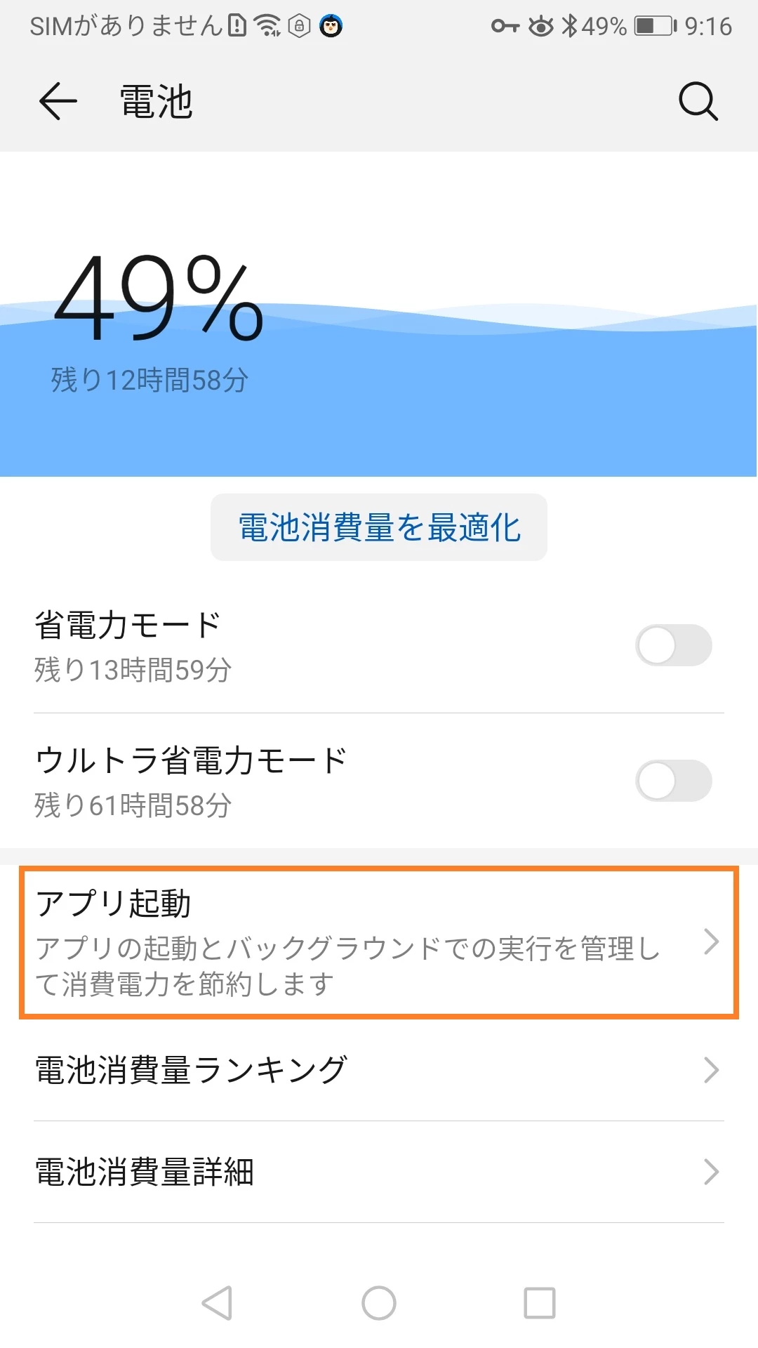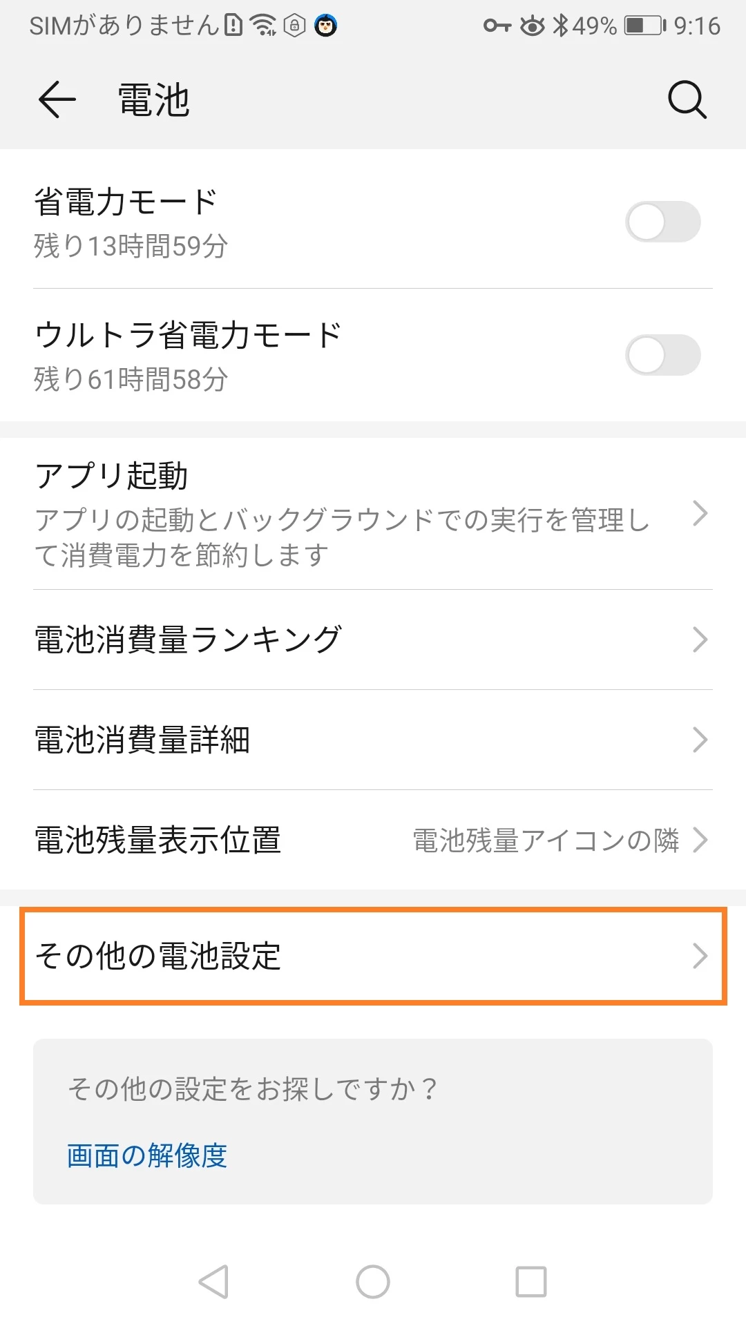 - バッテリー画面に戻り > 「その他のバッテリー設定」を開く(他のファームウェアでは、右上の設定アイコンをタップ) > 電力を多く消費するアプリの検出通知を無効にします。