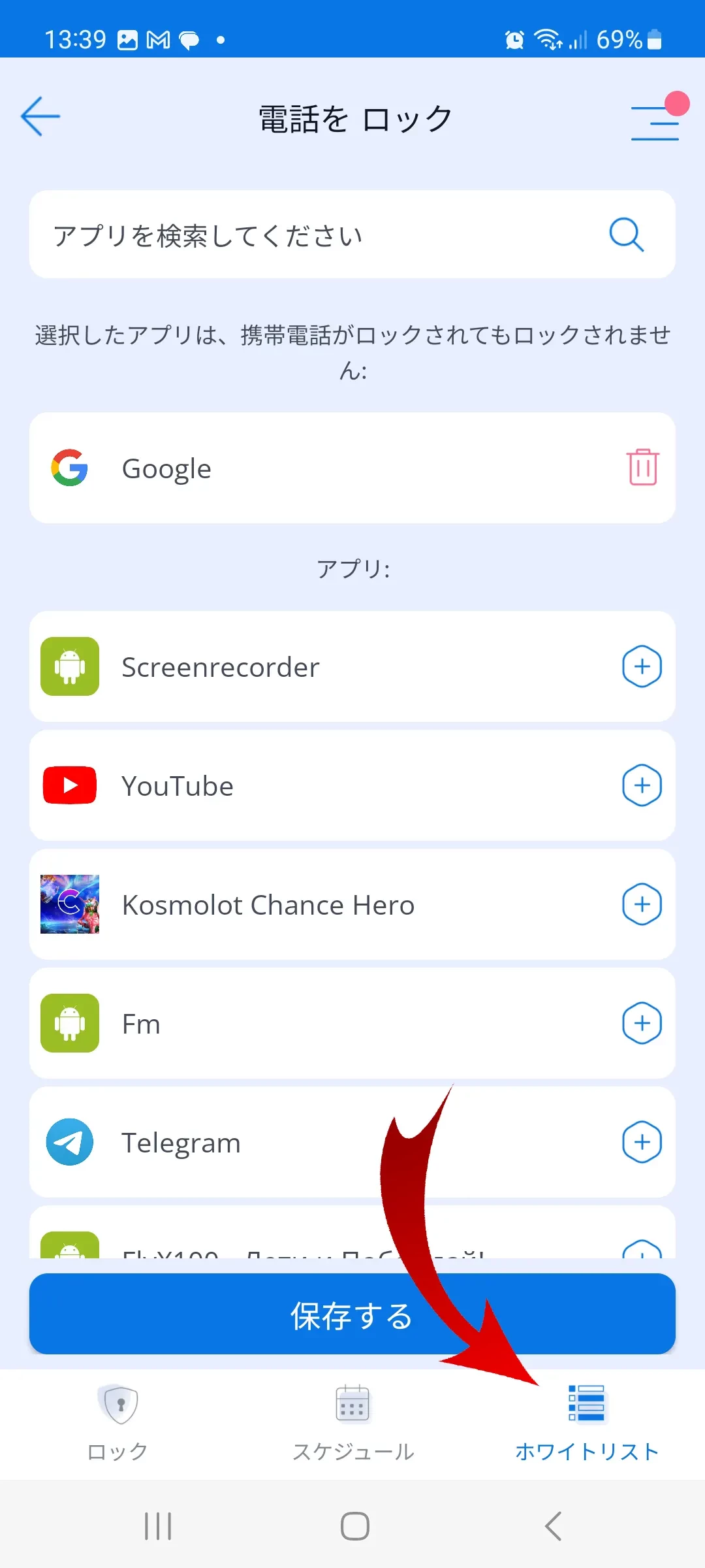 このセクションでは、スマートフォンがロックされているときにブロックされないアプリを追加できます。たとえば、親はメッセンジャーがブロックされることを望まない場合、それらをホワイトリストに追加します。