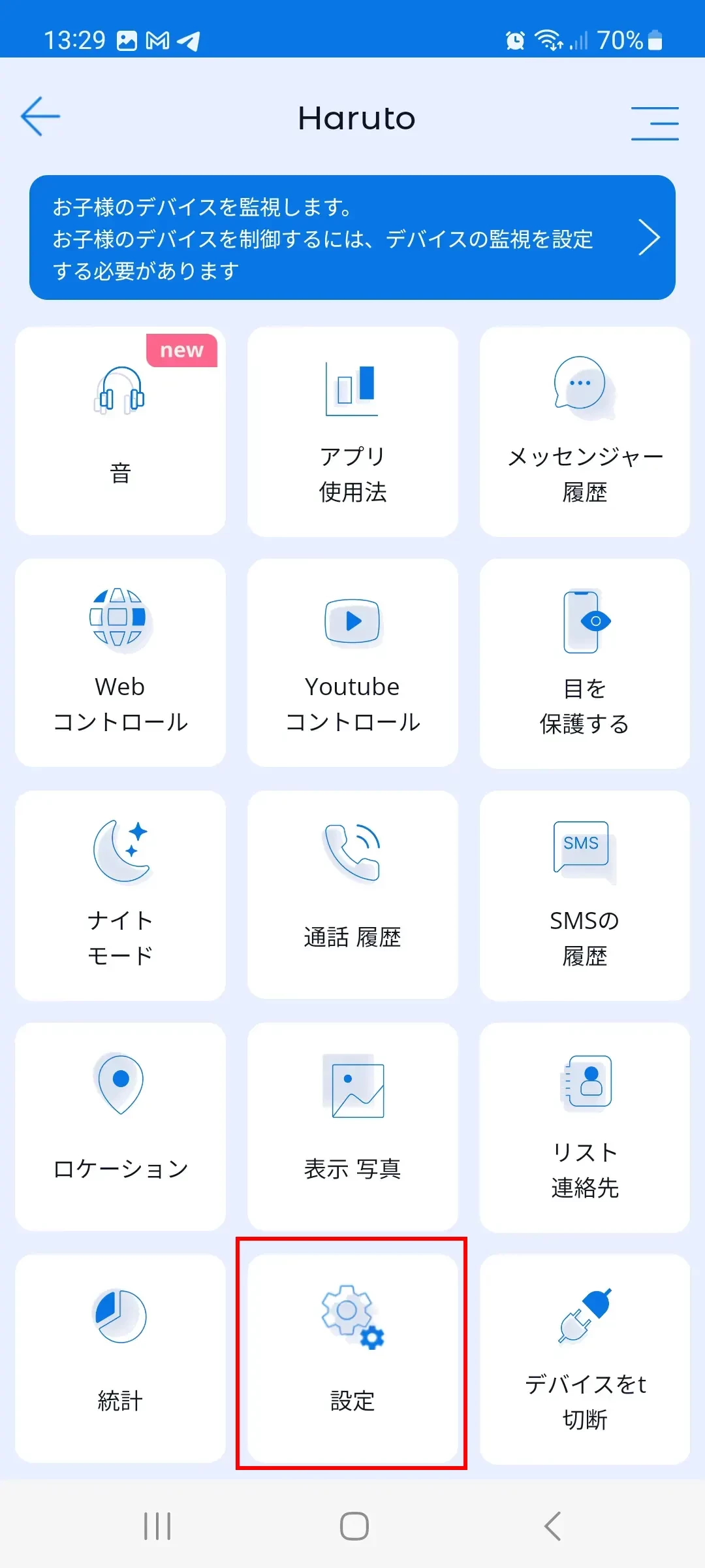メインメニューの「設定」ボタン:親デバイスから選択した子デバイスの設定を変更する機能。