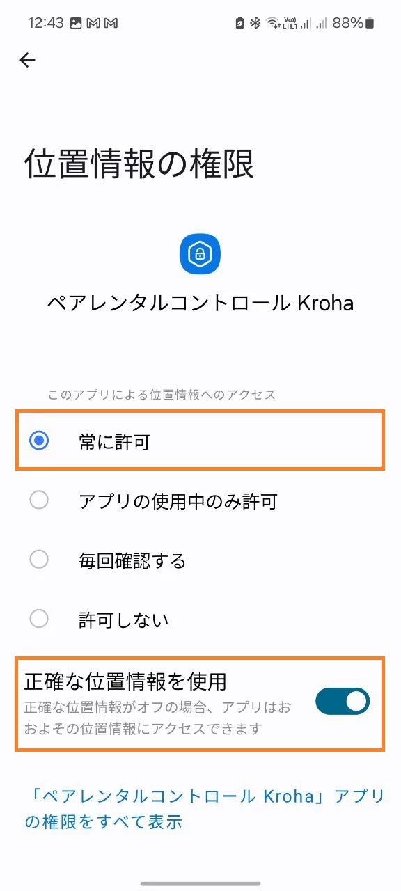 4. 子供のデバイスで設定アプリを開き > 位置情報 > アプリの権限 > Krohaペアレンタルコントロール > 「常に許可」を選択し、「正確な位置情報を使用する」スイッチを有効にします。