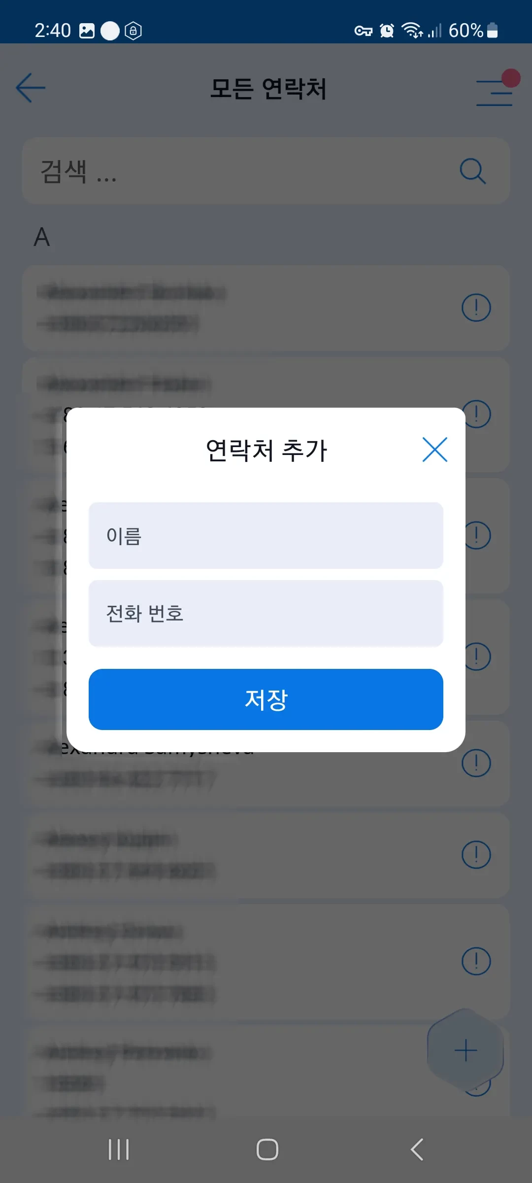 자녀의 휴대폰을 관리하는 Kroha 앱을 사용하는 부모는 스마트폰의 연락처 목록에 연락처를 추가하려면 화면 하단의 '+' 아이콘을 눌러야 합니다.