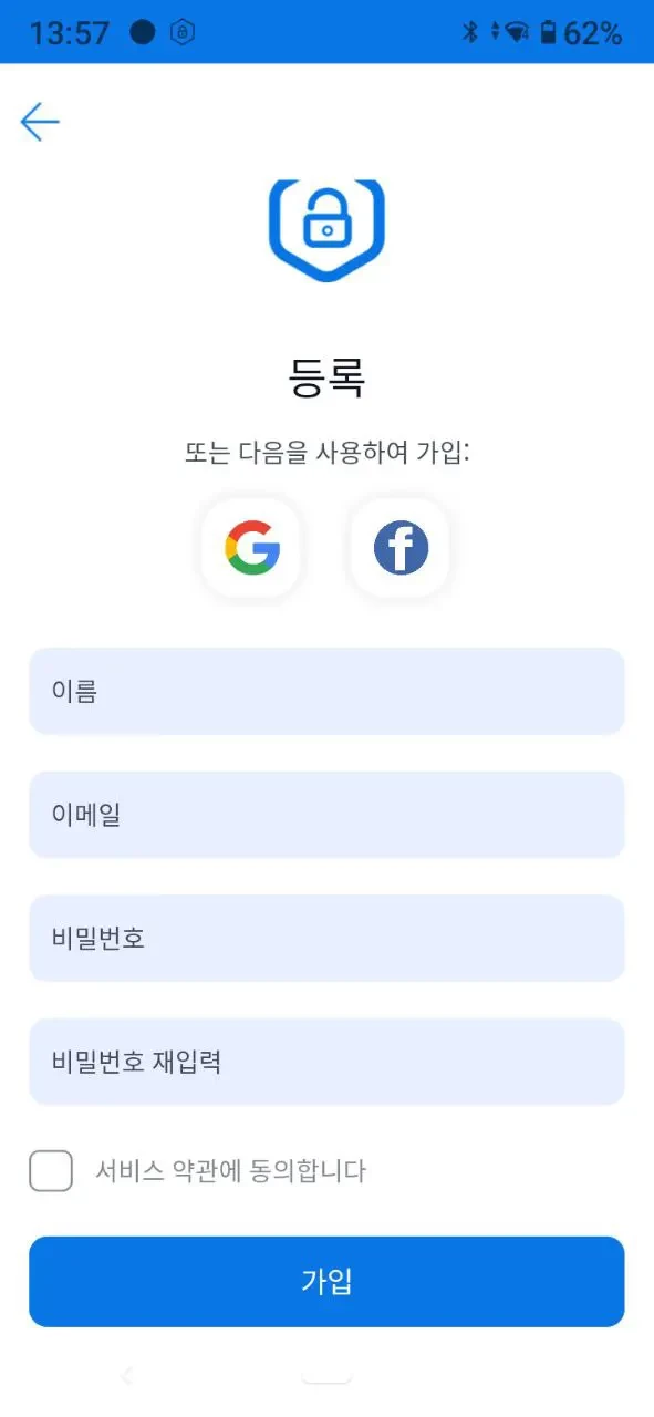 3. “등록” 화면에서 Apple 계정, Google 계정으로 등록하거나 이름, 이메일 주소를 입력하고 비밀번호를 생성할 수 있습니다.