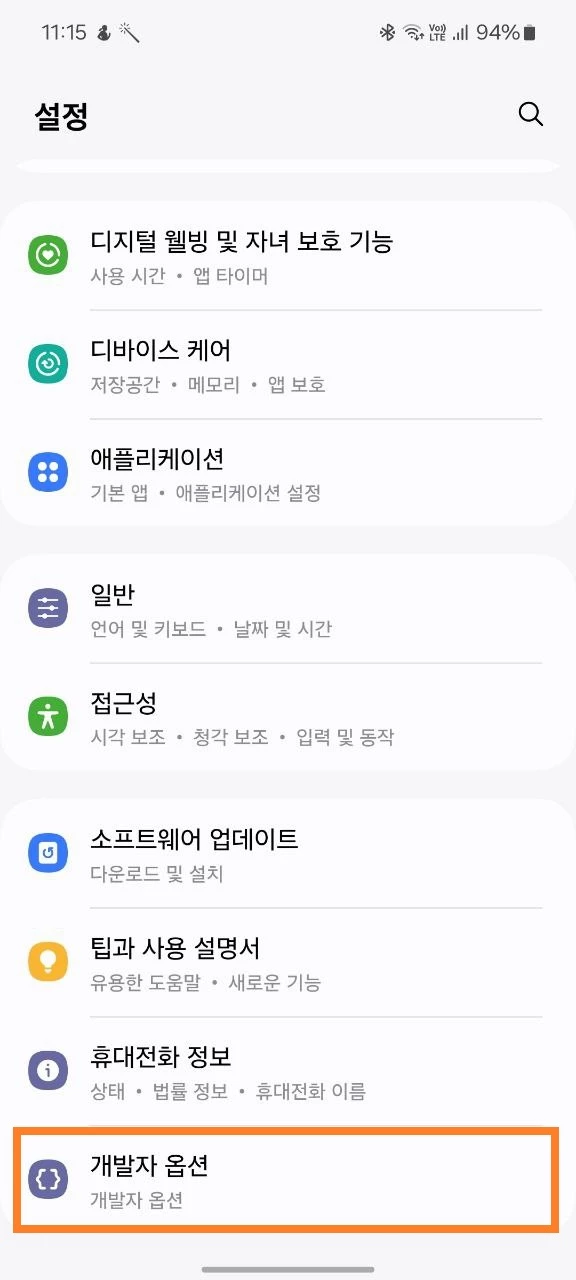 다음으로, 개발자 옵션으로 이동하기: