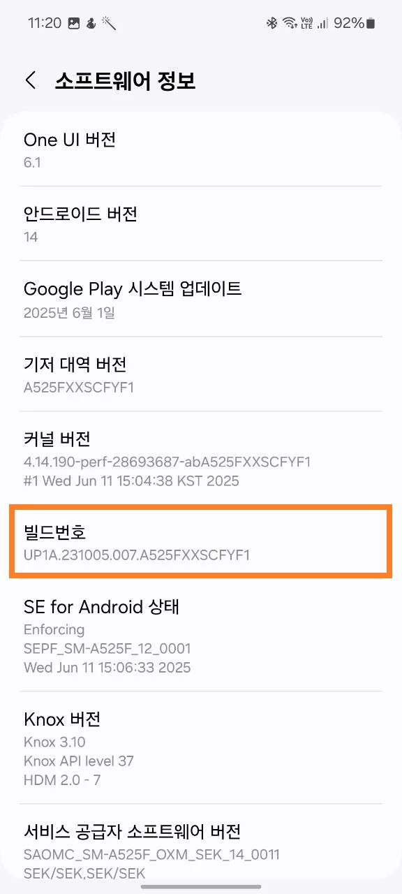 “빌드 번호” 항목을 찾아 5-8번 클릭하기;