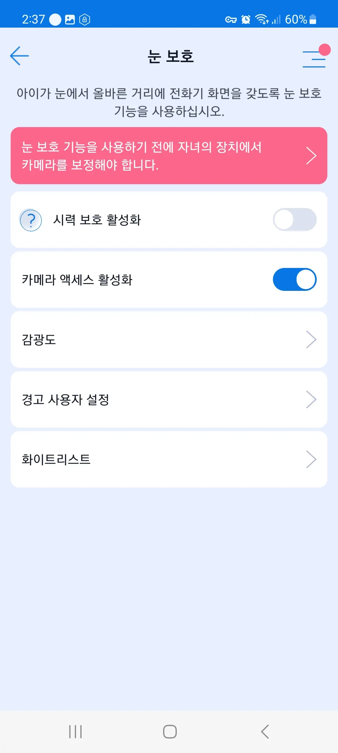화이트리스트: 눈 보호 기능이 특정 앱을 차단하지 않도록 하려면, 해당 앱을 화이트리스트에 추가할 수 있으며, 해당 앱이 실행될 때 화면이 잠기지 않습니다.