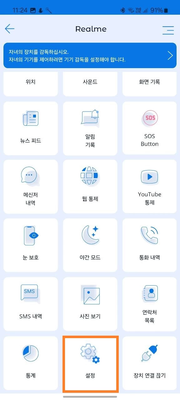 3. 부모의 기기에서 자녀의 휴대폰을 추적하는 Kroha 앱을 열고 -> 기기 목록에서 자녀의 기기를 선택한 후 -> 앱 메뉴에서 '설정'을 선택합니다.