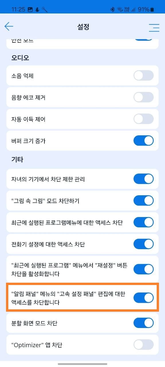 4. 알림 패널 메뉴에서 '빠른 설정 패널 편집 접근 차단' 설정을 활성화합니다.