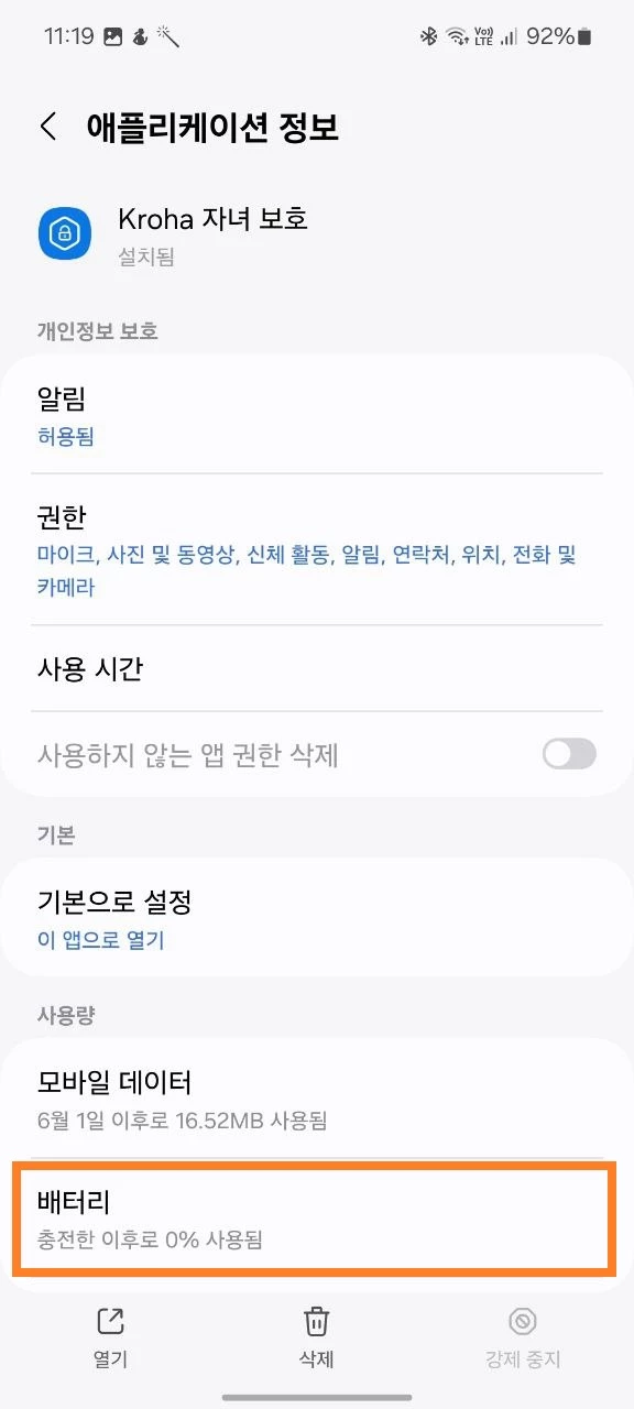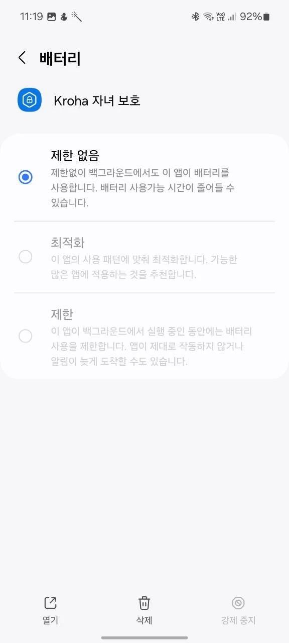 - 자녀의 기기에서 설정을 엽니다 > 기기 관리 > 배터리 > 백그라운드 제한 > Kroha 자녀 보호 앱이 대기 앱에 추가되었는지 확인합니다.