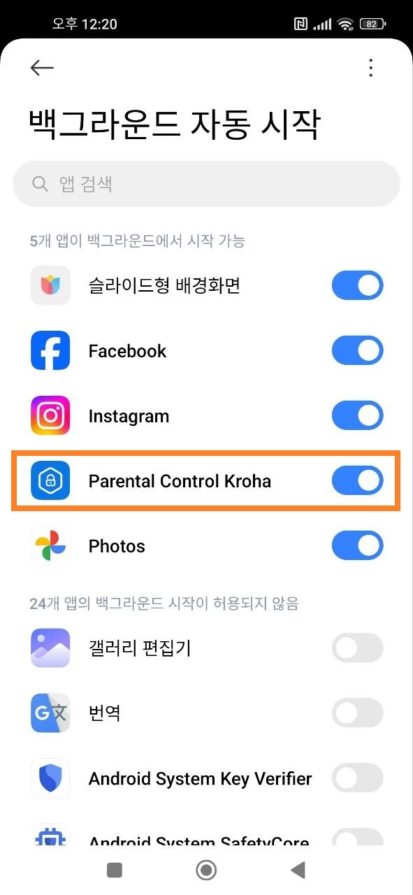 - 자동 시작 설정: 자녀의 기기에서 설정 앱을 열고 > 앱 섹션을 열고 > 앱 관리 > 백그라운드 자동 시작 > Kroha 자녀 보호 앱을 찾아 > 스위치를 켭니다.