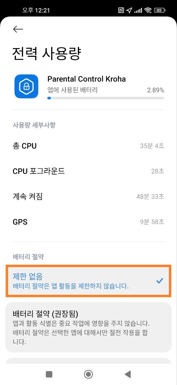 - 전원 절약 설정: 자녀의 기기에서 설정 앱을 열고 > 앱을 열고 > 앱 관리 > Kroha 자녀 보호 앱을 찾아 > 배터리 절약 열기 > "제한하지 않음"을 선택하세요.