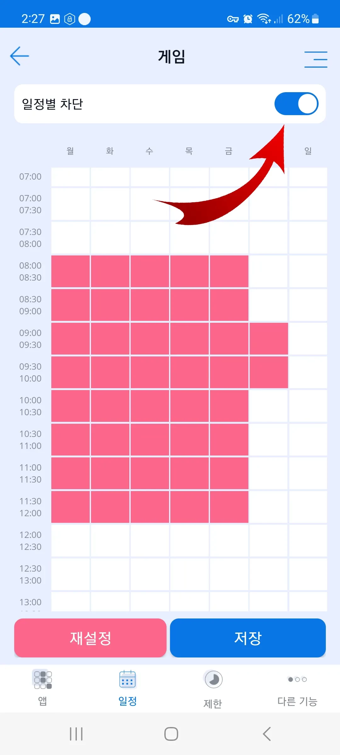 앱 차단 기능에서 일정표를 설정하려면, 부모는 자녀가 게임을 하거나 비디오를 시청하거나 소셜 미디어에서 소통함으로써 방해받아서는 안 되는 기간(예: 학교 시간)에 앱을 차단하도록 설정합니다. 기간 시작 부분의 셀을 클램프하여 원하는 시간대를 잠그고, 잠금 기간 끝까지 셀 선택을 드래그합니다. "일정 잠금" 토글을 활성화합니다. 선택한 셀에 해당하는 시간 동안 선택된 카테고리의 애플리케이션이 차단됩니다.
