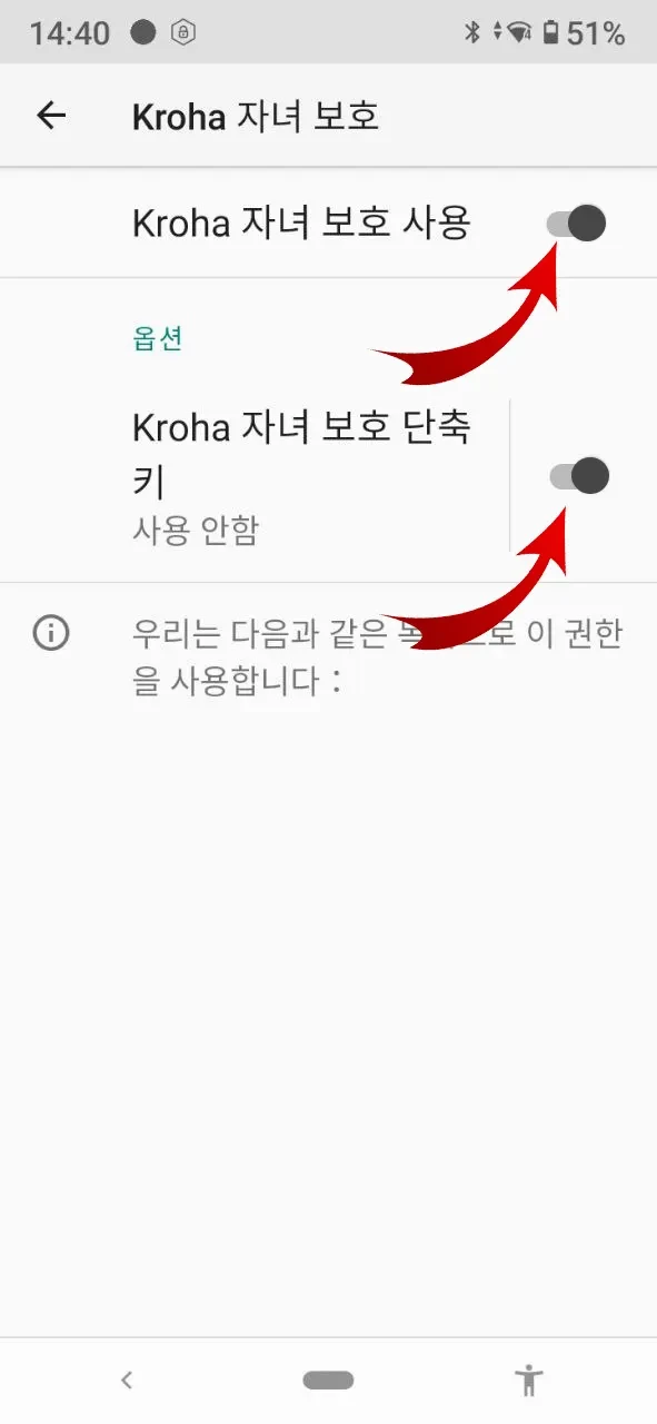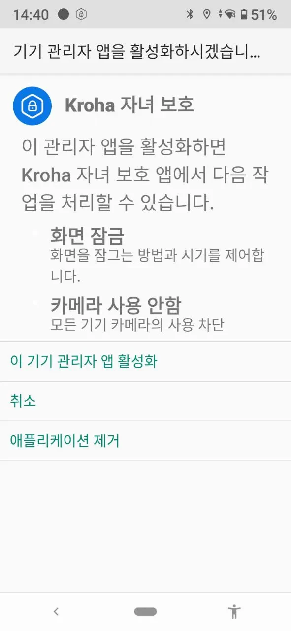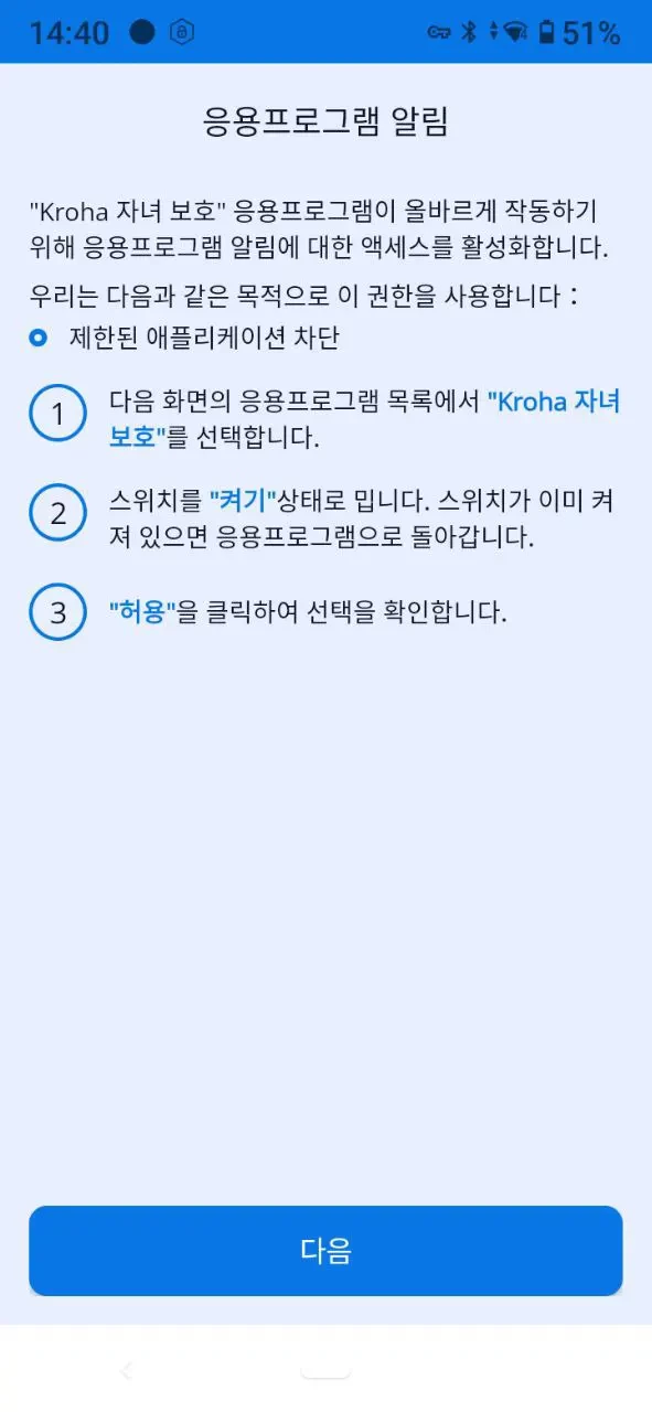 “앱 사용”: 자녀 보호 앱이 제대로 작동하려면 앱 사용 데이터 접근을 활성화하고, 자세한 내용은 단계별 안내를 참고한 후 “허용”을 탭하세요.