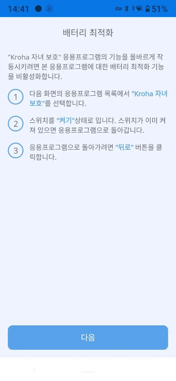 “배터리 최적화”: 앱이 제대로 작동하려면 자녀 보호 앱의 배터리 최적화를 비활성화해야 합니다. 자세한 내용은 단계별 안내를 참고한 후 “다음”을 탭하세요.